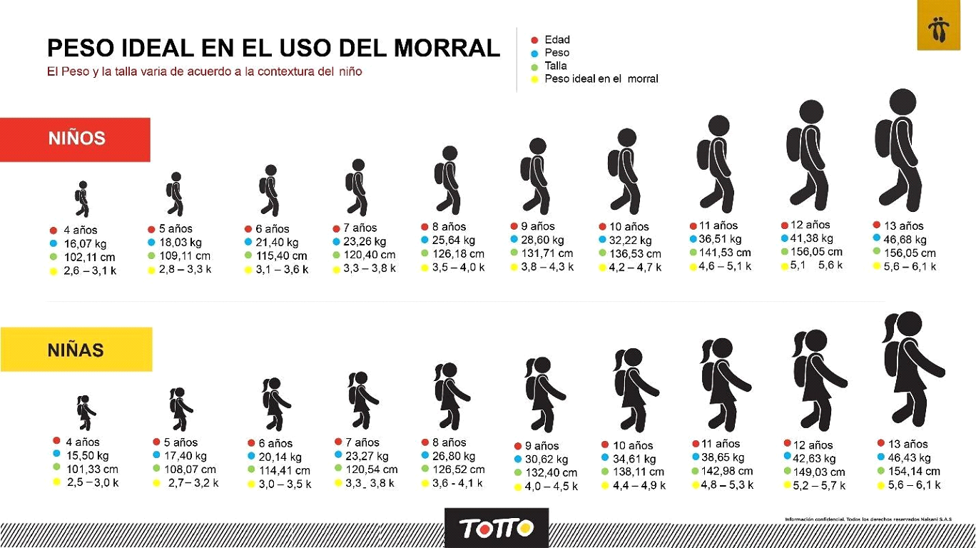 Lo primero que recomienda la empresa es tener en cuenta el peso del niño, ya que el morral cargado no debe exceder el 15% de ese valor. “Por ejemplo, si la persona pesa 35 kilos, el morral no debe exceder los 5 kilos”, explica la marca. “Los objetos más pesados se deben colocar en la parte posterior y los más livianos en la parte frontal, esto evitará desequilibrios ergonómicos”, explica Totto.