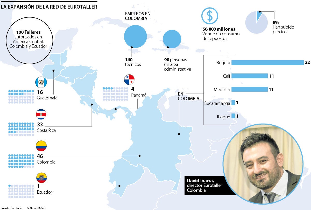 BR Racing Motor Sport, en Bogotá, es el taller de mecánica que se convirtió en el centro de servicio automotor número 100 de Eurotaller en Latinoamérica. La compañía de origen español señala que trabaja en conjunto con una serie de distribuidores aliados al proyecto, como son Importadora Cali y Checo Repuestos en Colombia; Akaisan, en Ecuador; Daitomo, en Costa Rica y Panamá; y Distribuidora Roan, en Guatemala. La red “da acceso a información técnica, capacitación actualizada, campañas de publicidad, repuestos originales y una identidad corporativa”, dice Ibarra.