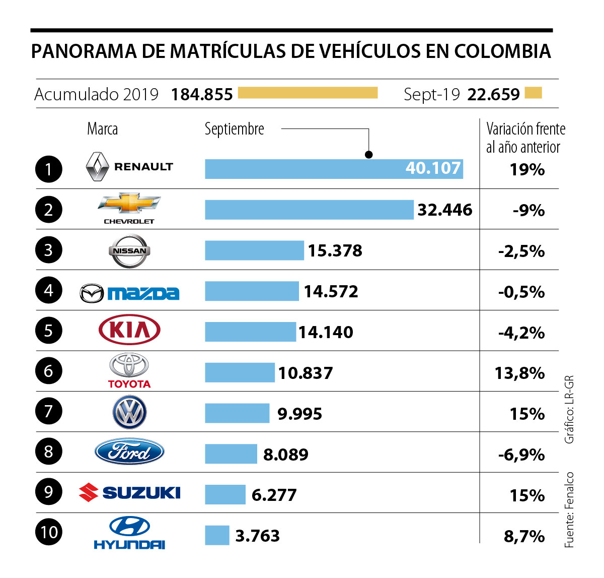 Uno de los casos más sobresalientes es el agresivo crecimiento de la línea Kwid de Renault, el cual, a pesar de haberse lanzado en marzo de este año, está en el puesto ocho de los 20 carros más matriculados en lo que va del año, mientras que el Chevrolet Sail ha tenido una caída de más de 44%.