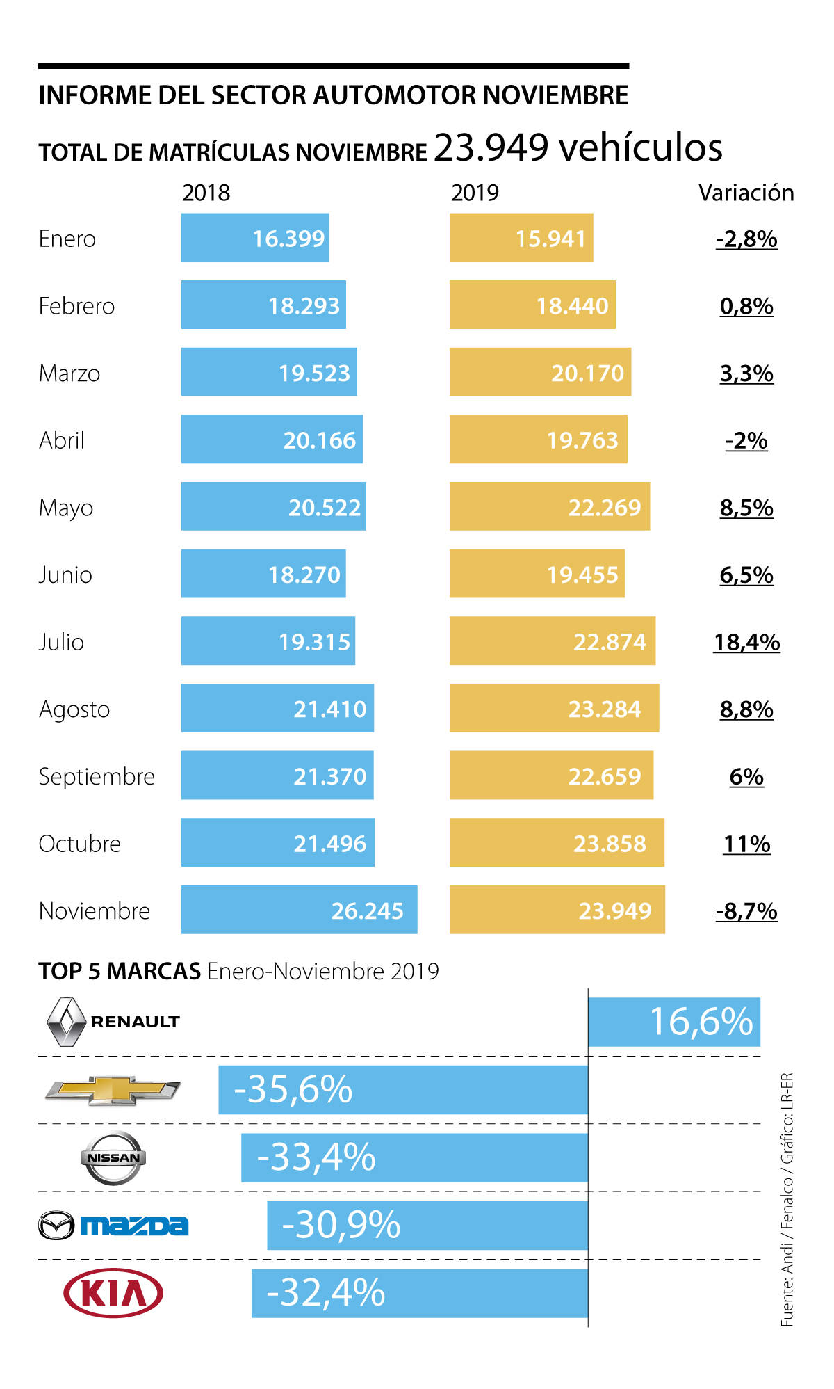 Varias de las caídas se profundizaron en noviembre, que es el tercer mes del año con decrecimientos después de pasar siete meses con tendencia al alza. Enero y abril fueron los otros periodos en los que se registraron caídas en el sector automotor.