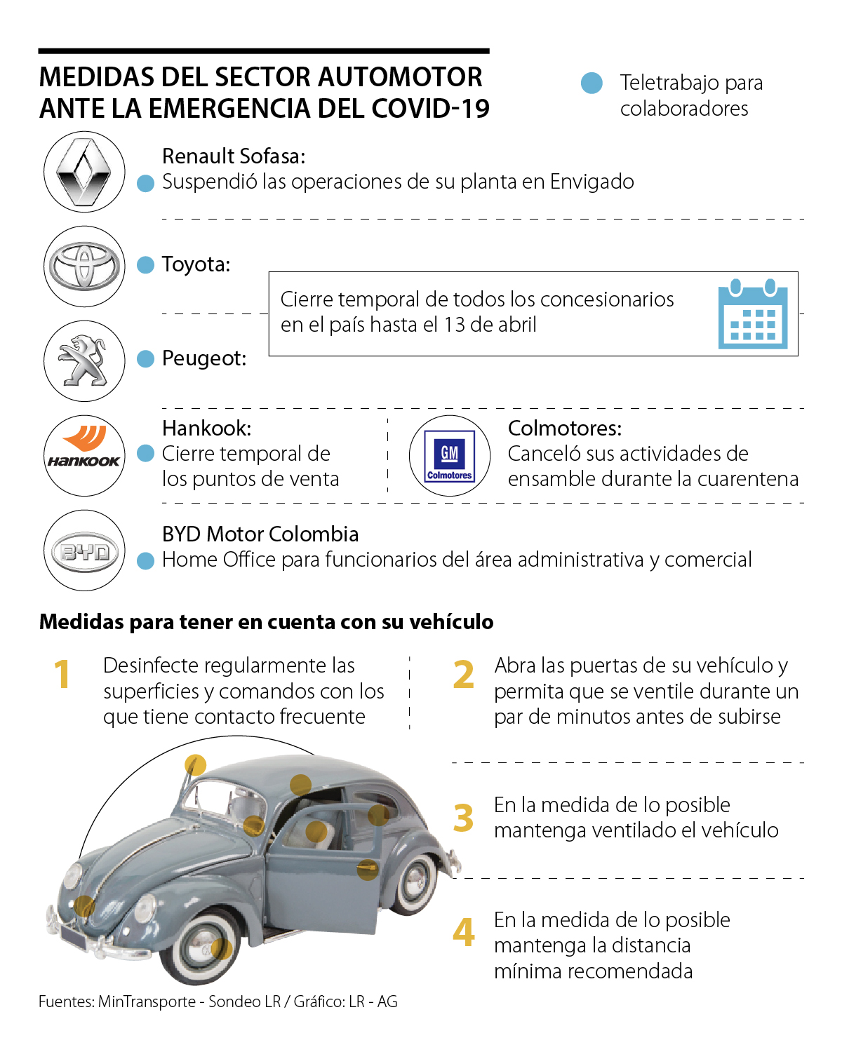 Entre estas, el teletrabajo, turnos con diferencias de horario para sus colaboradores, vacaciones anticipadas y reuniones virtuales o telefónicas. Así mismo, en los concesionarios y talleres se han reforzado la desinfección de los lugares de trabajo y plantas. No obstante, desde que se decretó la cuarentena nacional, la mayoría de marcas han decidido suspender sus operaciones.