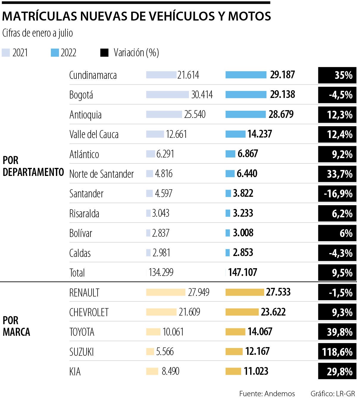 La Asociación Nacional de Movilidad Sostenible (Andemos) reveló que entre enero y julio de este año se han matriculado más de 147.000 motos y vehículos. Si se tiene en cuenta que en 2021, durante este mismo periodo, hubo 134.299 matrículas, la variación entre los dos años arrojó 9,5%. Por marcas, Renault lidera las cifras con 27.533 nuevos registros, aunque esto representó una caída de 1,5%, pues en los primeros siete meses del año pasado logró 27.949 registros.