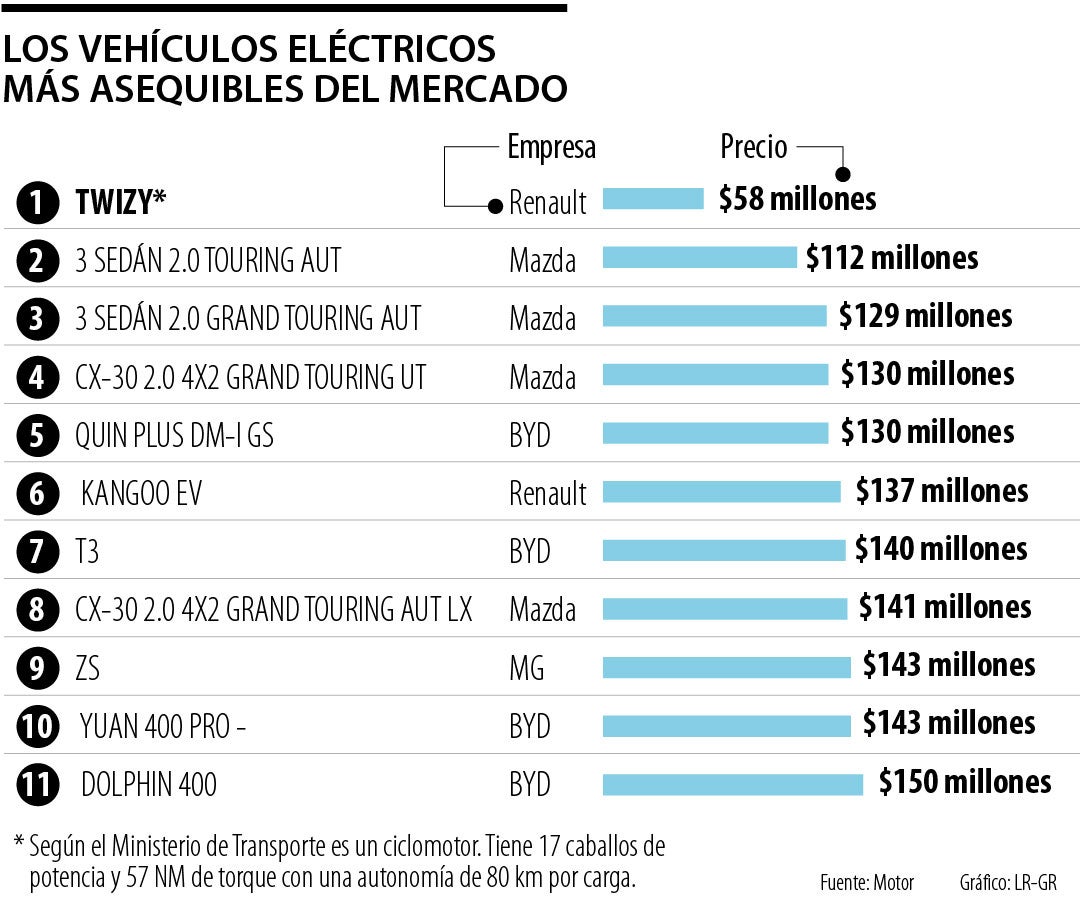 Para este año, los vehículos híbridos y eléctricos más económicos en el mercado nacional son: el Twizy de Renault, que vale $58 millones; el Mazda 3 sedán 2.0 Touring Aut, que cuesta $112 millones; el Mazda 3 Sedán 2.0 Grand Touring Aut, de $129 millones; la Mazda CX-30 2.0 4x2 Grand Touring Aut, a $130 millones; y el Quin Plus DM-I GS de BYD, que vale $130 millones.