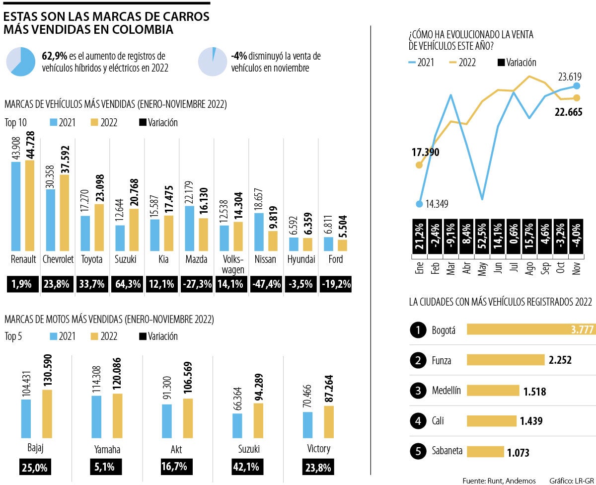 La marca francesa Renault se ha posicionado como la más vendida en el mercado colombiano por segundo año consecutivo, registrando 44.728 unidades entre enero y noviembre de 2022, lo que ya constituye una variación positiva de 1,9% respecto al año anterior, según cifras de la Asociación Nacional de Movilidad Sostenible (Andemos) y el Runt.