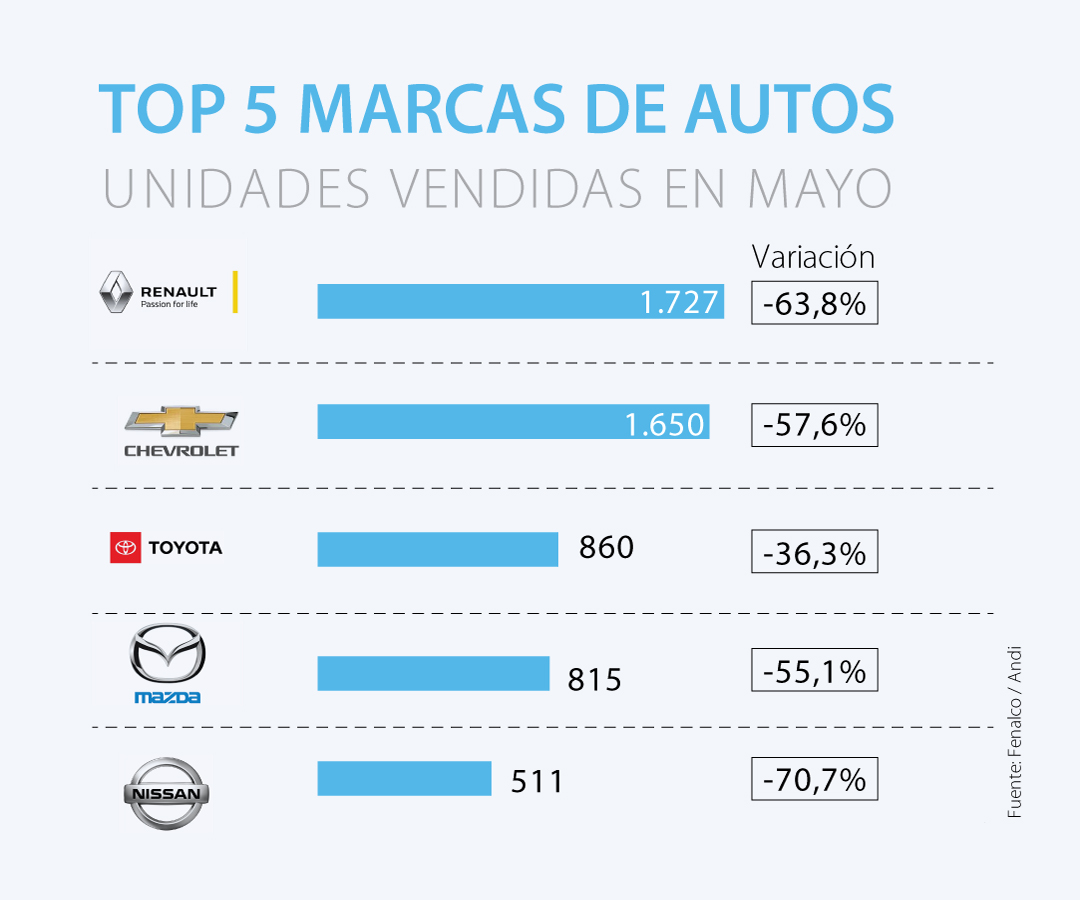 Al ver el acumulado del año, en segundo lugar, también se ubica Chevrolet, con 10.592 matrículas y una baja de 39,4%. En tercer puesto está Mazda, con 5.191 autos (-35,2%); en el cuarto Nissan, con 5.087 unidades (-39%) y después Kia, con 4.362 vehículos.