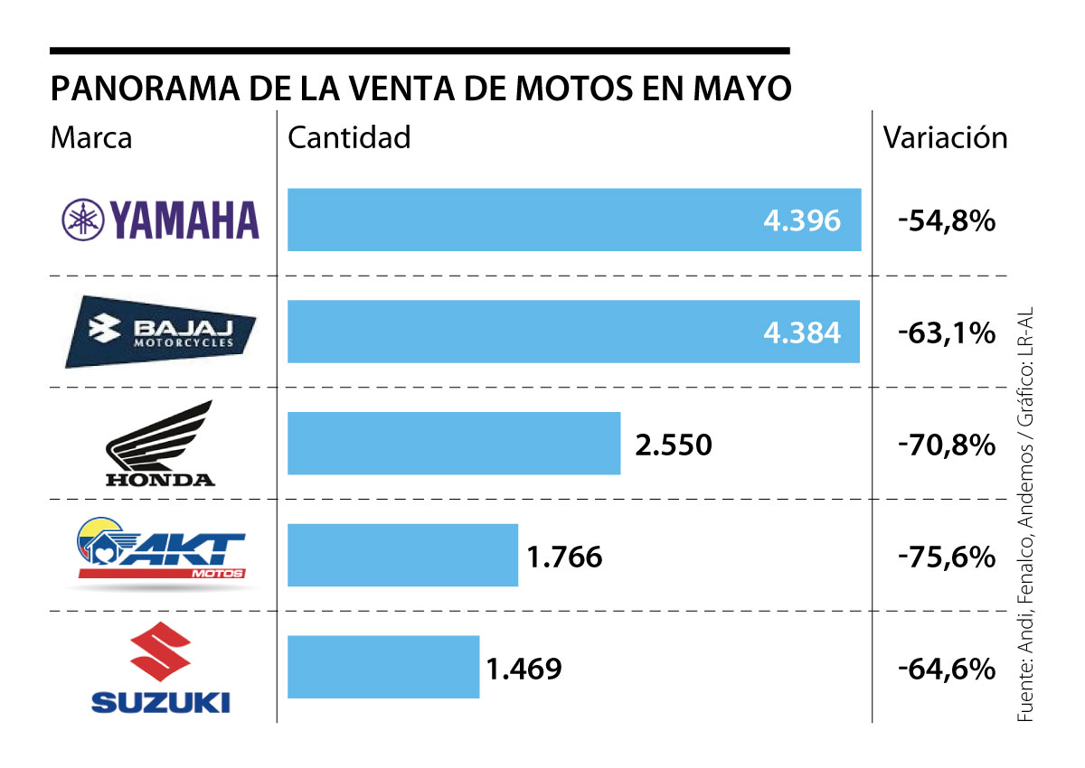 Para las motos el panorama también es desalentador en lo que va del año las cifras permanecen en rojo. En mayo, Yamaha lideró las ventas con 4.396 motos registradas, pero con una disminución de 54,8%, frente a mayo de 2019.