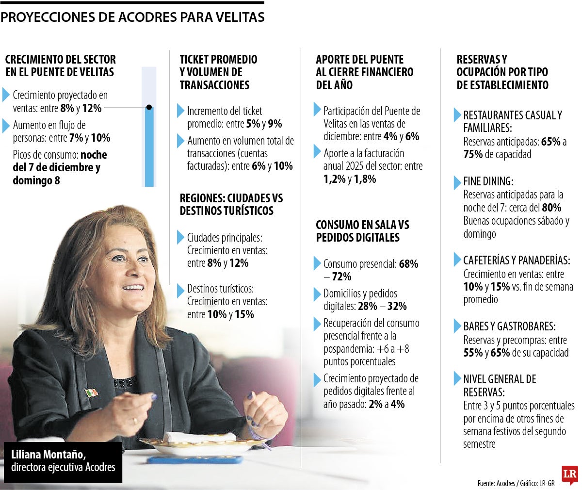 El sector gastronómico se alista para uno de los primeros grandes picos de consumo de diciembre con el puente de Velitas. De acuerdo con proyecciones de Acodres Bogotá Región, las ventas del sector podrían crecer entre 8% y 12% frente al mismo periodo del año pasado, dependiendo del tipo de establecimiento y la zona de la ciudad.