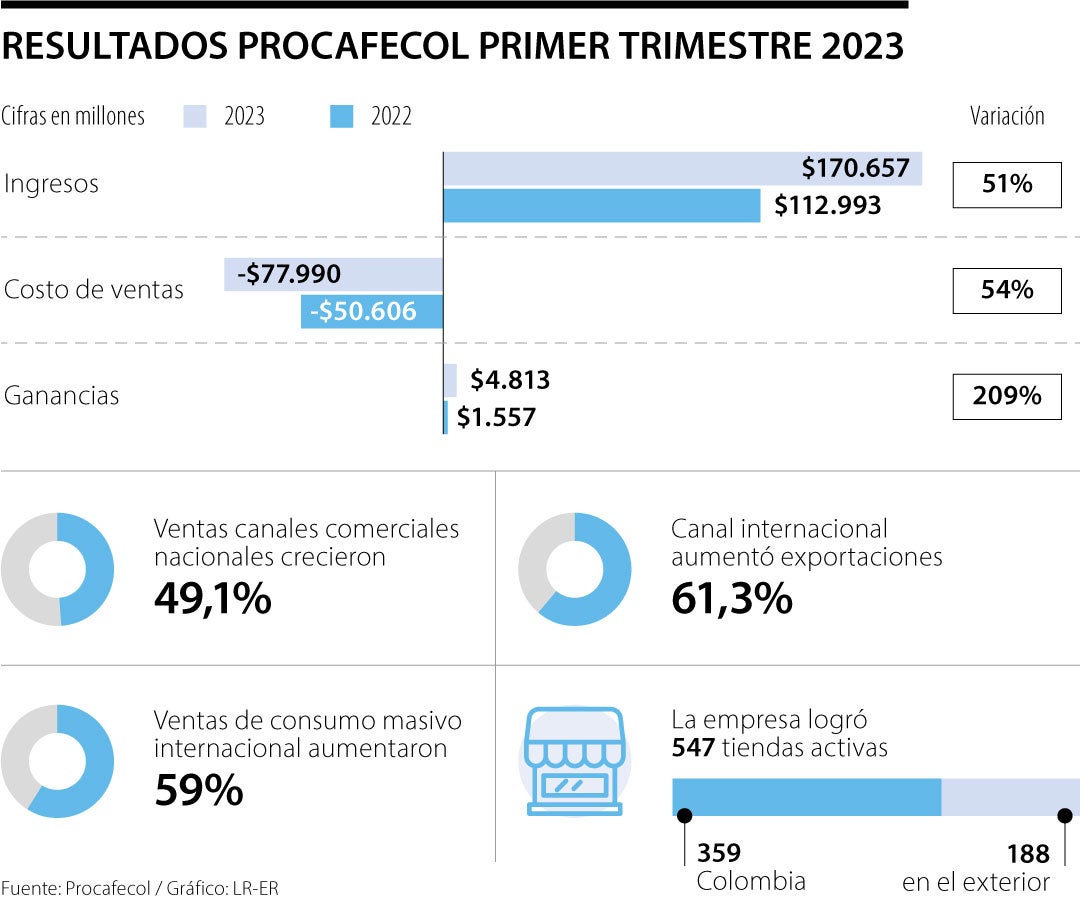 Según la empresa un buen impulso vino del alza de 41,9% de las ventas, tanto en precios como en cantidad, en canales comerciales nacionales de producto. A esto se sumó la buena dinámica en las tiendas de café, donde son líderes con 547 locales (359 en Colombia). Acá Procafecol explicó que la venta creció soportada no solo en precios, sino en número de transacciones.