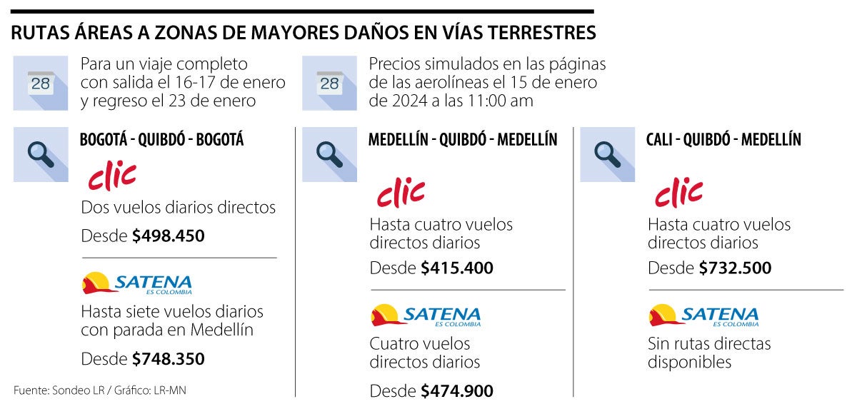 La oferta actualmente está con Satena y Clic, principalmente, aunque en los buscadores Avianca aparece, la aerolínea explicó que no viaja a Quibdó, pues (la pista de ese aeropuerto no puede recibir los Airbus 320) aeronaves de la empresa.