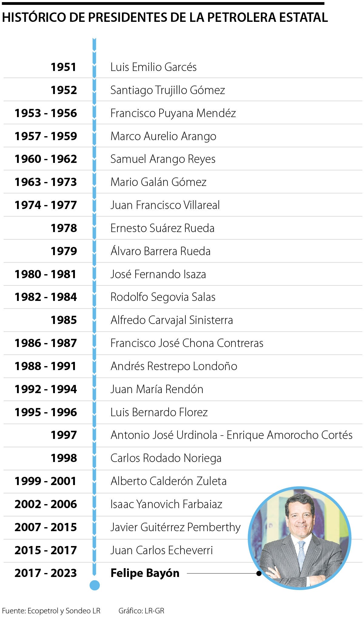 Ecopetrol anunció mediante un comunicado que Felipe Bayón estará al frente de la compañía hasta el 31 de marzo de 2023. Bayón, quien ha estado al frente de la empresa más importante de Colombia desde 2017, recibió un reconocimiento por parte de la Junta Directiva tras conocerse la decisión.