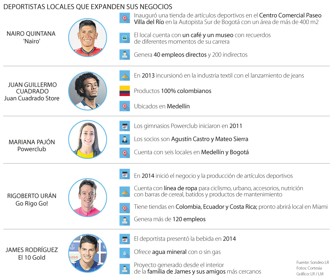 Muchos también usan sus empresas para impactar causas sociales, y hoy se puede decir que hay un boom de emprendimientos liderados por figuras como los futbolistas James Rodríguez, Juan Guillermo Cuadrado, Juan Fernando Quintero, y de los ciclistas Nairo Quintana, Rigoberto Urán; y Mariana Pajón.