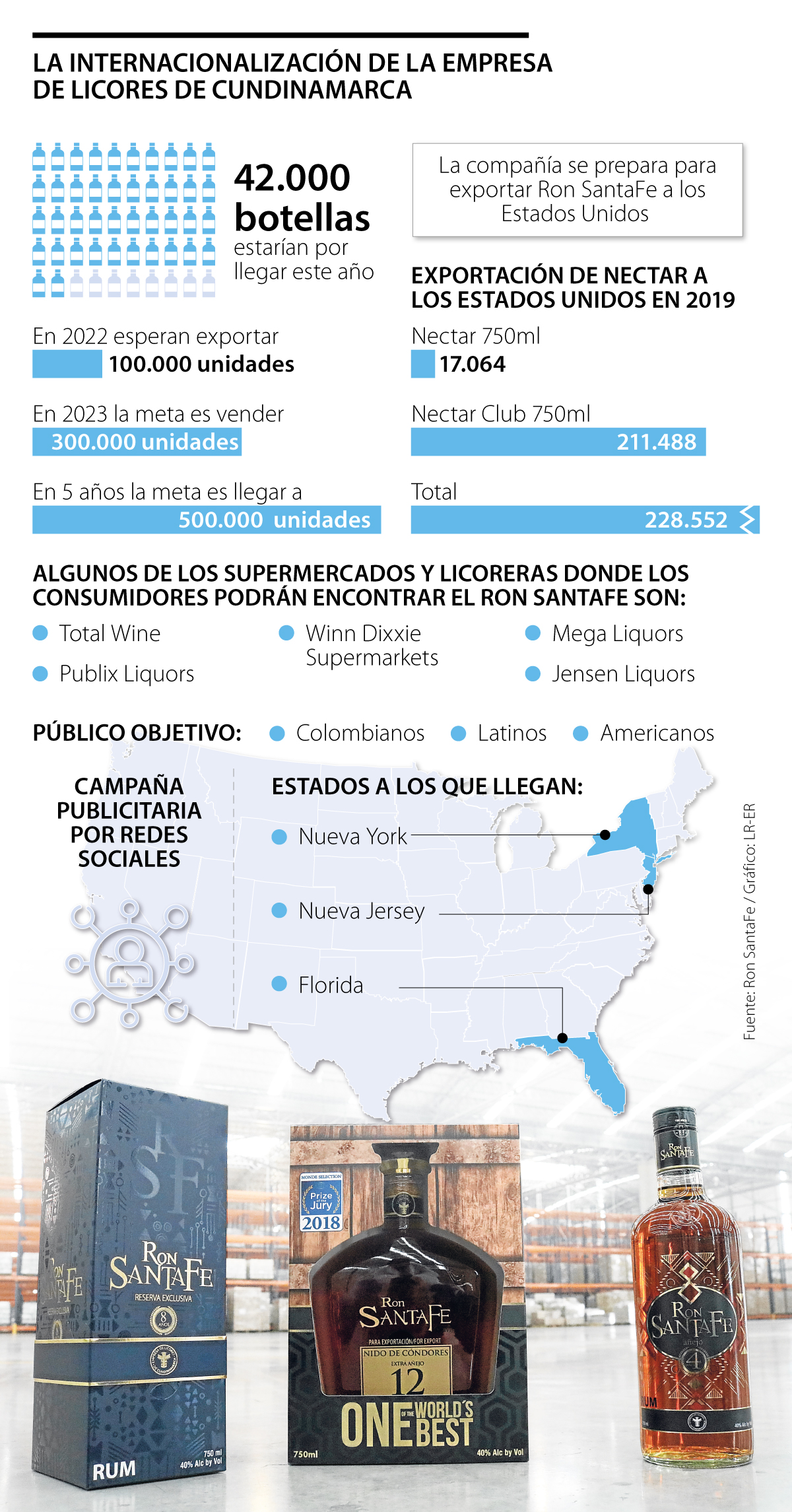 Luego de entrar con aguardiente Nectar al mercado estadounidense en 2019 y exportar más de 220.000 unidades, la Empresa de Licores de Cundinamarca se prepara para llegar con el Ron SantaFe a Estados Unidos.