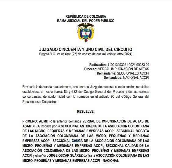 "Este despacho resuelve admitir la anterior demanda verbal de impugnación de actas de asamblea incoada por la seccional de Antioquia, Bogotá, Cauca, Caldas y el señor Jorge Oscar Suárez contra la Asociación Colombiana de las Micro, Pequeñas y Medianas Empresas, Acopi Nacional".