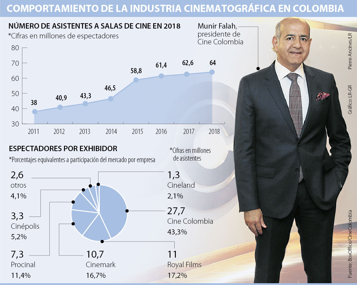 La cifra estuvo un poco por debajo de las expectativas que estaban en 66 millones, sin embargo, se vio un alza de 2,2% en comparación con 2017. De este grupo, 43,3% fue la cuota que puso Cine Colombia, es decir 27,7 millones, lejos de sus competidores más cercanos que son Royal Films, quienes obtuvieron en 2018 17,2% del mercado (11 millones de entradas vendidas), y Cinemark con 16,7% (10,7 millones de espectadores).