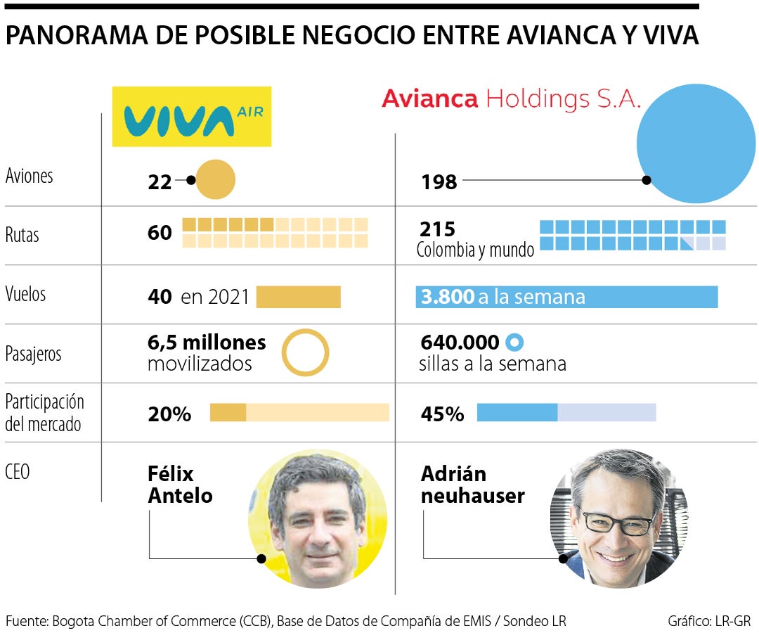 Lo primero es que a la fecha Viva Air cuenta con 60 rutas y 22 aviones y Avianca con 128 rutas en operación, según cifras actualizadas por las compañías. Además, ambas concentran 51% de los pasajeros que se movilizan en Colombia, pues Viva transportó 5,1 millones en 2021 y Avianca 9,7 millones en el mismo año.