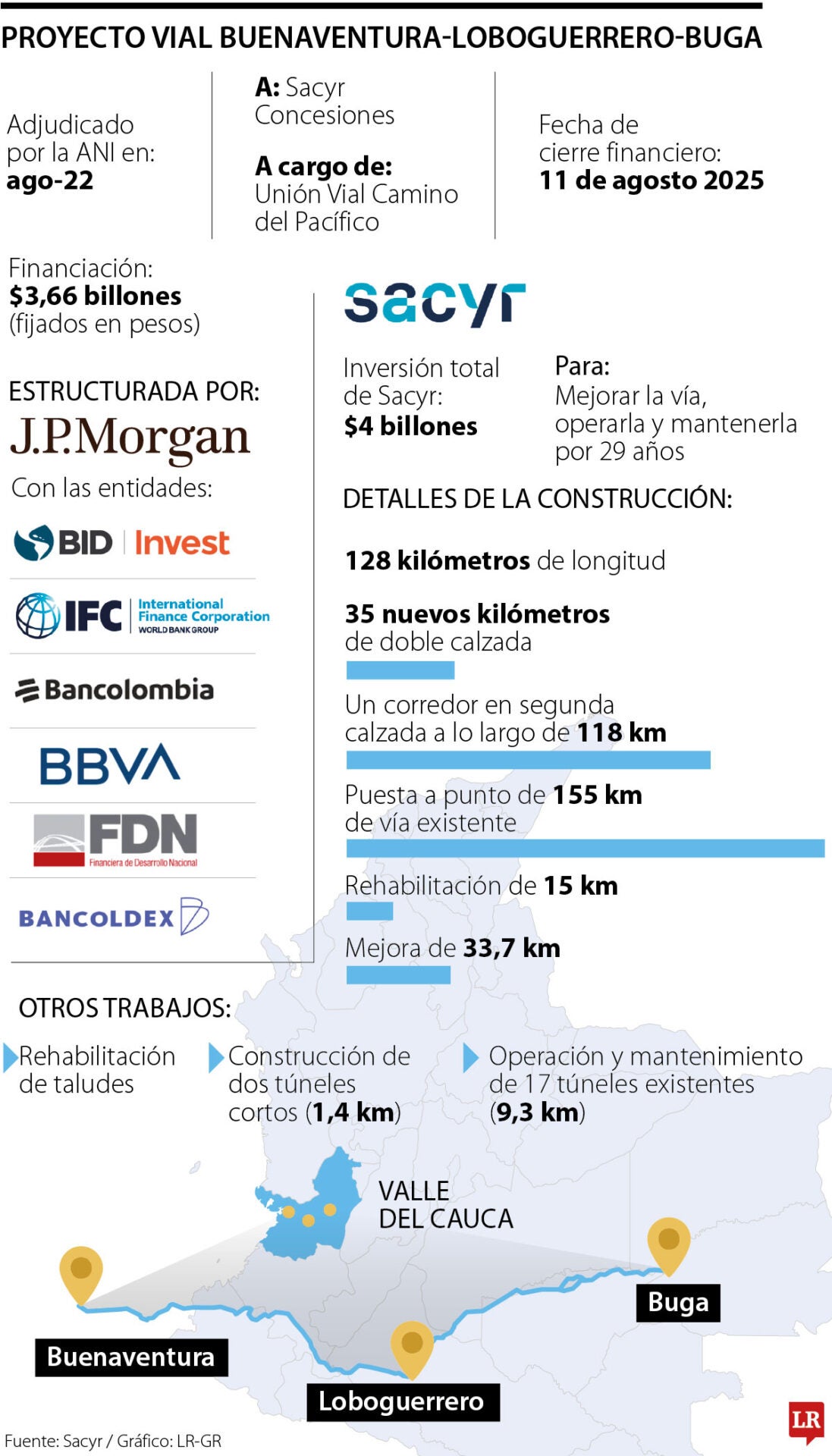 Sacyr Concesiones anunció el cierre de la financiación para la concesión del corredor vial Buenaventura - Loboguerrero - Buga por un monto de $3,66 billones, la cual fue fijada en pesos colombianos para evitar posibles impactos de fluctuación de moneda. Este hito se da luego de tres años de que la Agencia Nacional de Infraestructura, ANI, adjudicara el proyecto.