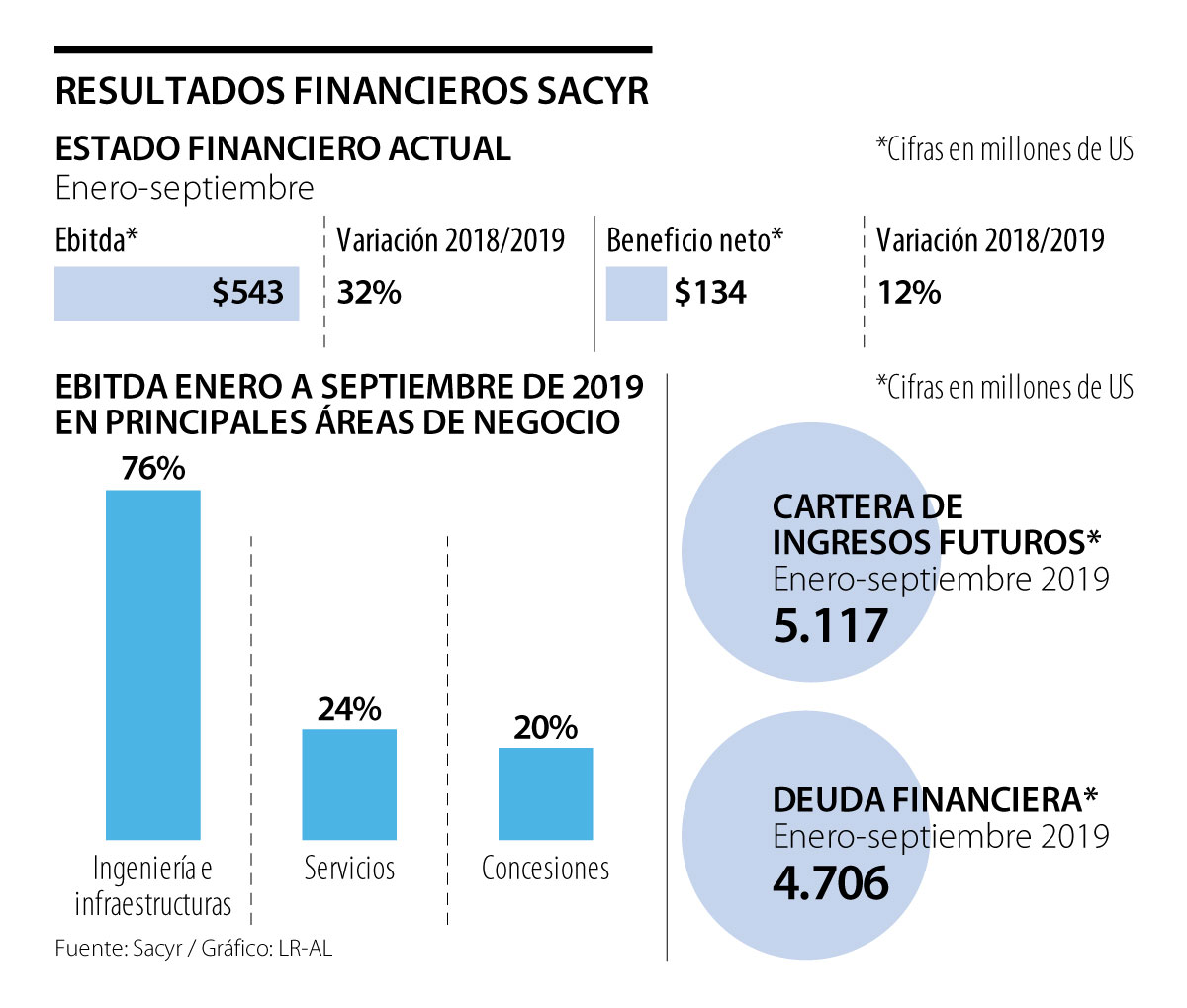 La empresa de construcción, Sacyr, reveló los resultados financieros de la compañía entre enero y septiembre de 2019, en este se evidenció que obtuvieron un Ebitda de más de US$593 millones, lo que equivale a el 32% más que en el mismo periodo del año anterior.