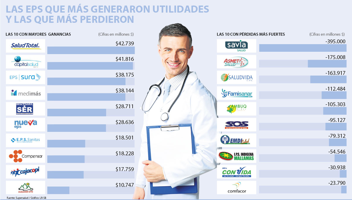En cuanto al top cinco de las EPS con mejores ganancias, la de rendimientos más altos fue Salud Total, con $42.739 millones; luego Capital Salud, con $41.816 millones; EPS Sura, con $38.175 millones; Medimás EPS, que obtuvo $38.144 millones; y Mutual Ser, $28.711 millones.