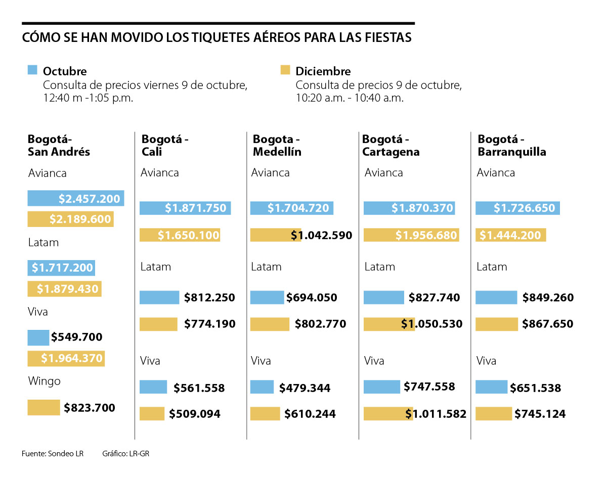 Hace dos meses (9 de octubre), LR hizo un ejercicio de buscar tarifas en las principales rutas desde el 21 de diciembre al 3 de enero en los portales web de Avianca, Latam y Viva Air. En esta ocasión se hizo lo mismo y se comparó con los nuevos valores arrojados para conocer la variación. Los tiquetes escogidos de cada aerolínea fueron rutas directas, ida y vuelta, en las categorías “altas” o premium.