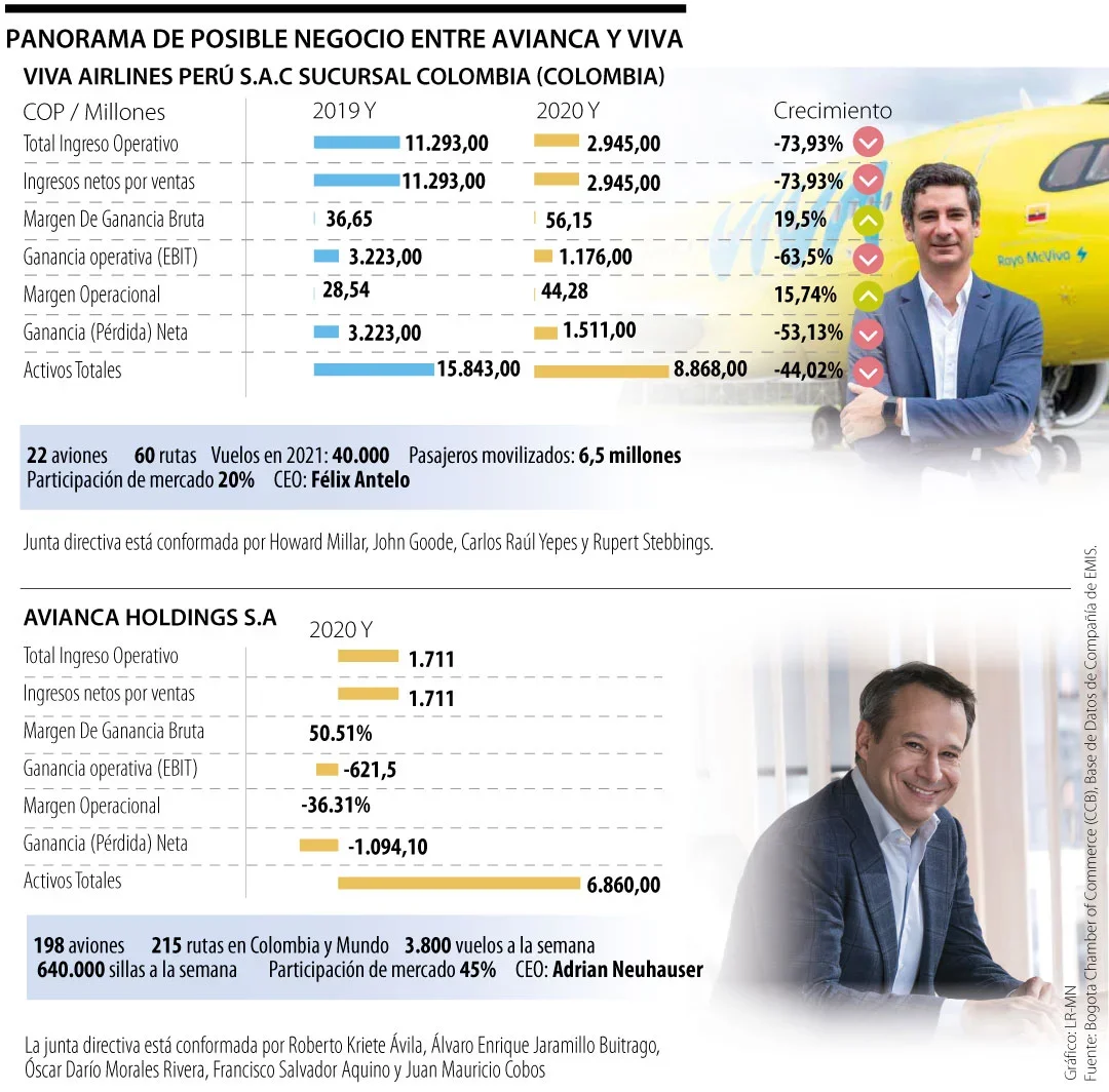 Viva opera 46 rutas domésticas en Colombia y Perú y 14 rutas internacionales a Estados Unidos, México, Perú, República Dominicana, Argentina y Brasil. Los ingresos de Viva en Colombia fueron de $2.945 millones en 2020, lo que representó una caída de 73% frente a 2019, por la crisis generada por la pandemia; sin embargo su Ebit llegó a $1.176 millones (-63%) y la ganancia fue de $1.511 millones (-53% frente a 2019). Se espera que los resultados de 2021 mejoren ampliamente, teniendo en cuenta la reactivación económica del país, y especialmente del turismo, y esto influya en las proyecciones que se hicieron dentro del negocio.