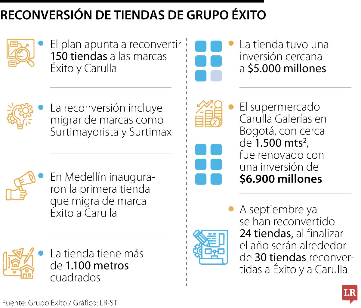 Giraldo mencionó que esta reconversión se enmarca dentro del plan que tiene la compañía para unificar la operación bajo las marcas de Éxito y Carulla, que apunta a la intervención de 150 tiendas en un lapso de entre tres o cuatro años. Actualmente, el Grupo Éxito aglutina a Surtimax, Surtimayorista y Superinter.