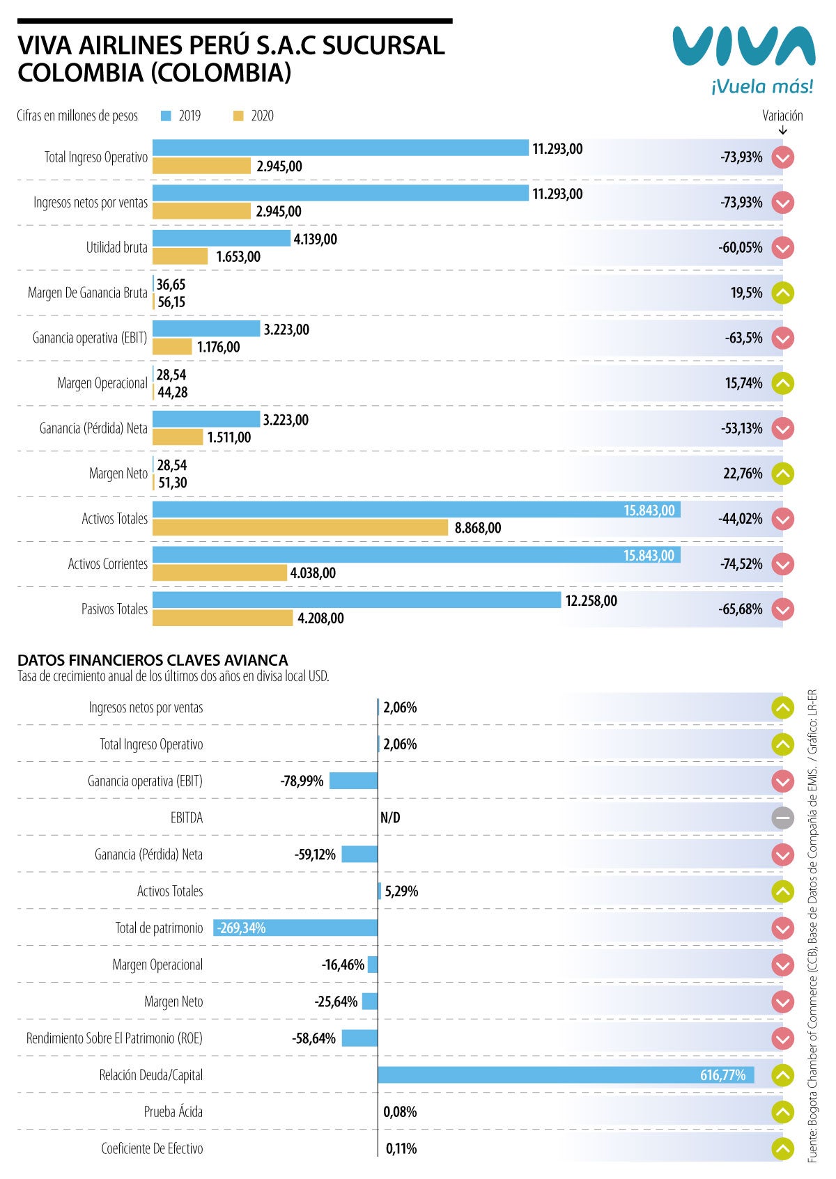 Según los resultados a 2020 los ingresos de Viva sucursal Colombia fueron de $2.945 millones, lo que representó una caída de 73% frente a 2019, por los daños de la pandemia. En el caso del Ebit este llegó a $1.176 millones (-63%) y la ganancia fue de $1.511 millones (-53% frente a 2019); así que faltaría analizar con mayor detalle los resultados de 2021, que incluyen la recuperación del turismo para hacer los cálculos del negocio.