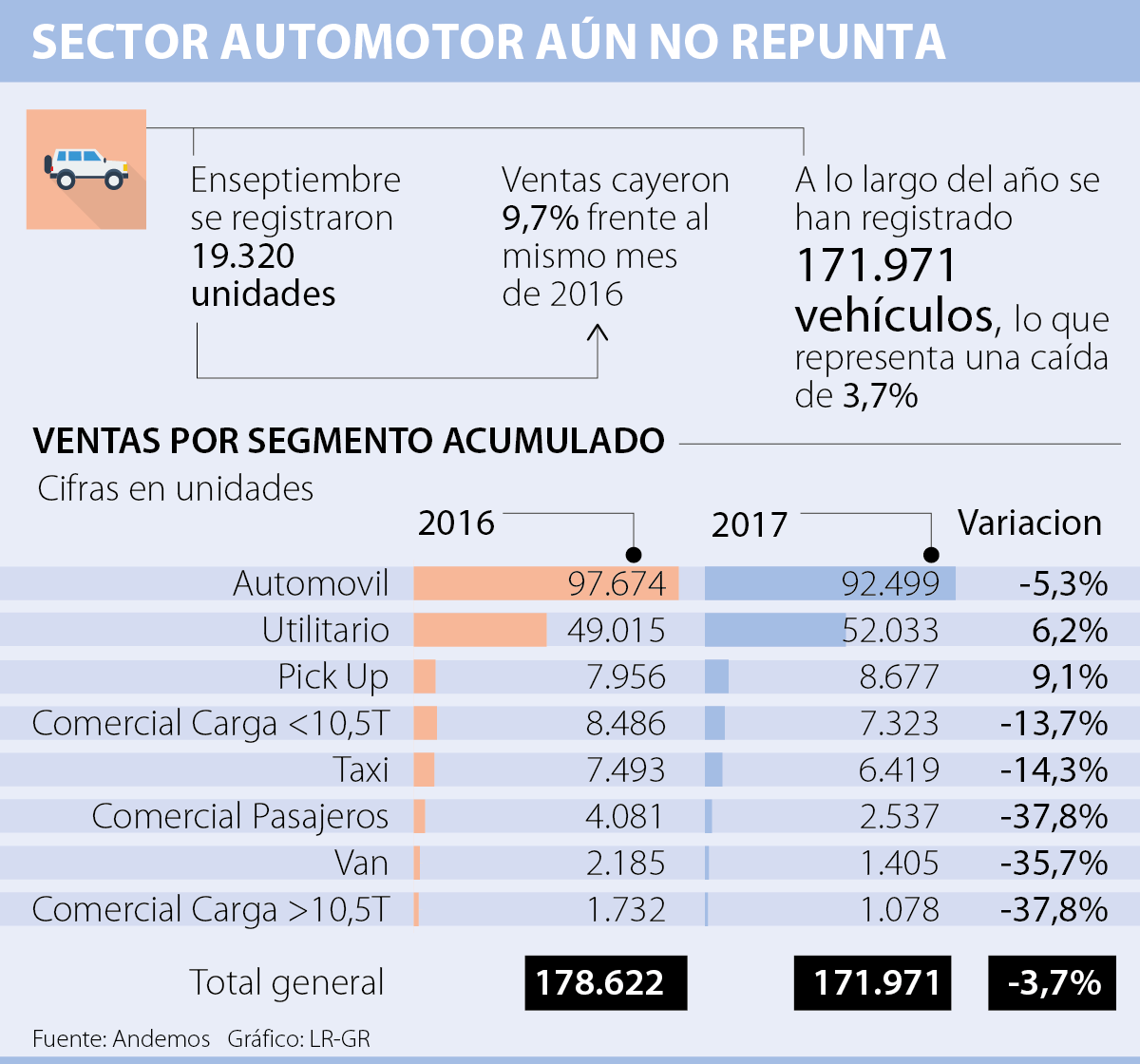 El sector automotor aún no levanta cabeza y así lo confirmaron las últimas cifras de Fenalco, Andi y Andemos, las cuales revelaron que al cierre del noveno mes del año se registraron un total de 171.971 vehículos, lo que representó una caída de 3,7% frente al mismo periodo del año pasado.