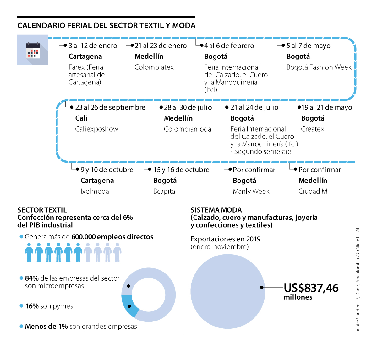 Entre los eventos están Cali Exposhow, Colombiatex, Bogotá Fashion Week, Colombiamoda, y la Feria Internacional del Calzado, el Cuero y la Marroquinería
