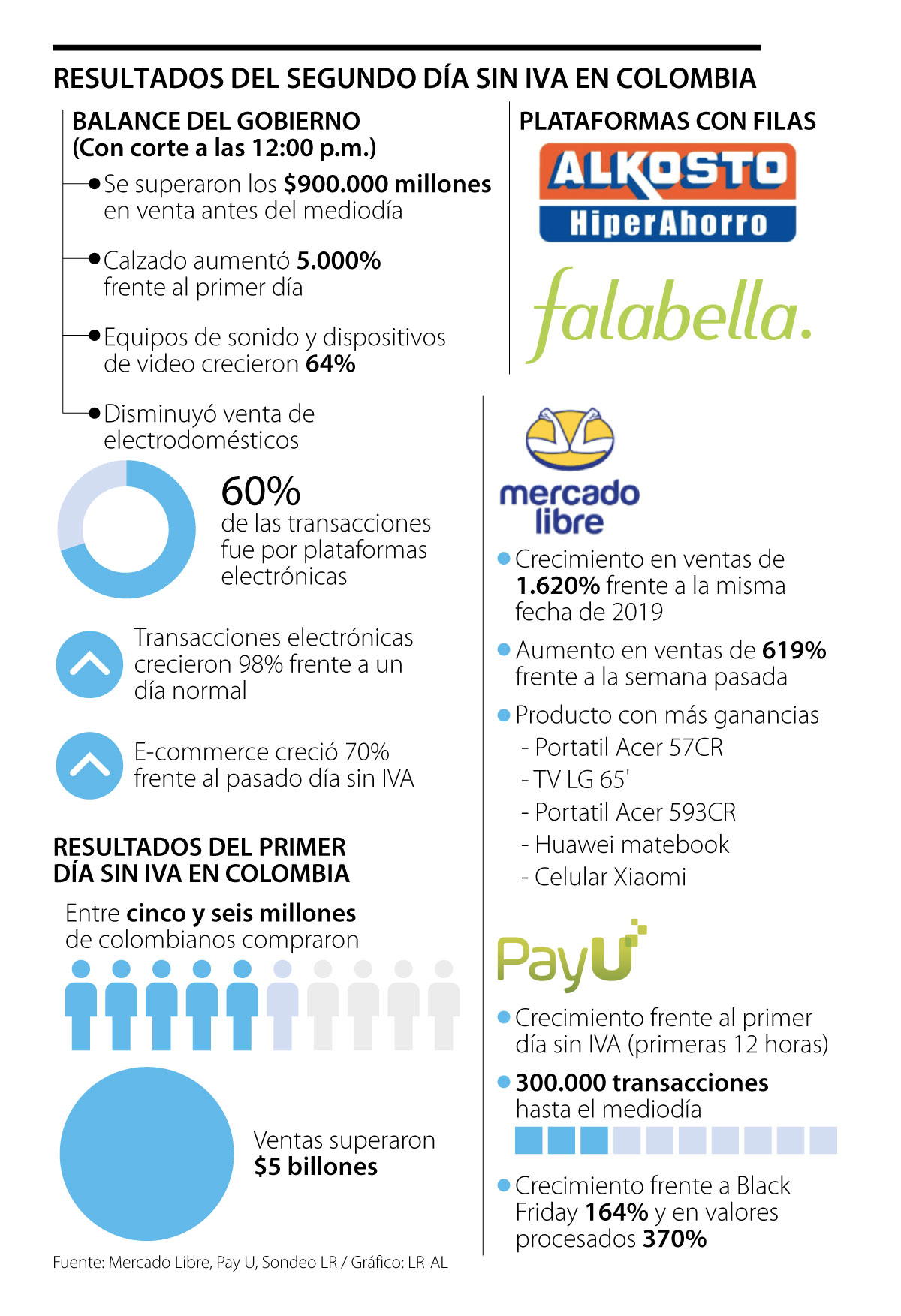 De acuerdo con el ministro de Comercio, José Manuel Restrepo, las transacciones realizadas crecieron 92% vs. el año anterior, y los valores transados aumentaron 57% en el canal digital. Comparado con el primer día sin IVA se creció 19% en transacciones y 33% en valores tranzados. “El mayor valor del e-commerce en la historia”, agregó el funcionario.