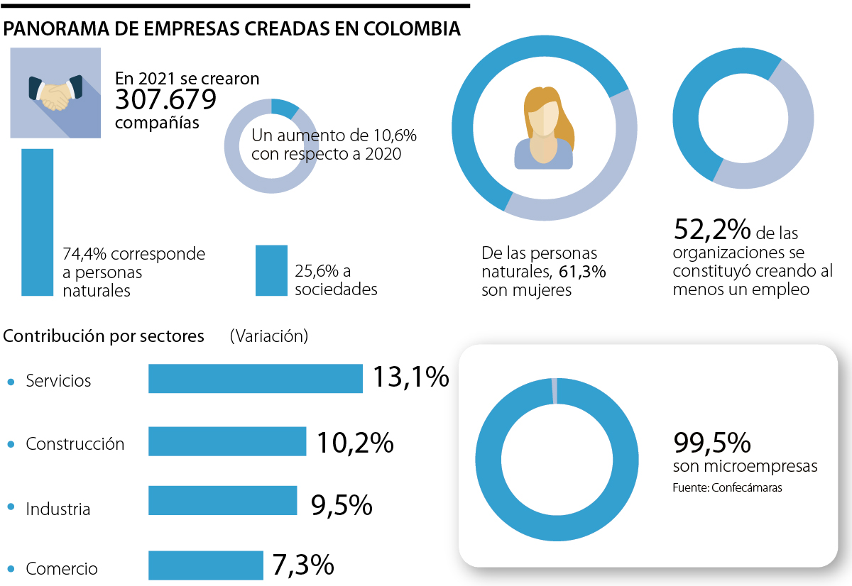 La creación de microempresas creció en 10,6% con respecto a 2020, al pasar de 276.891 a 306.140. Las medianas empresas evidenciaron un aumento de 1,5% al pasar de 68 a 69 unidades productivas nuevas en 2021. Finalmente, las grandes organizaciones presentaron un crecimiento de 40%, al pasar de 15 a 21 nuevas unidades.