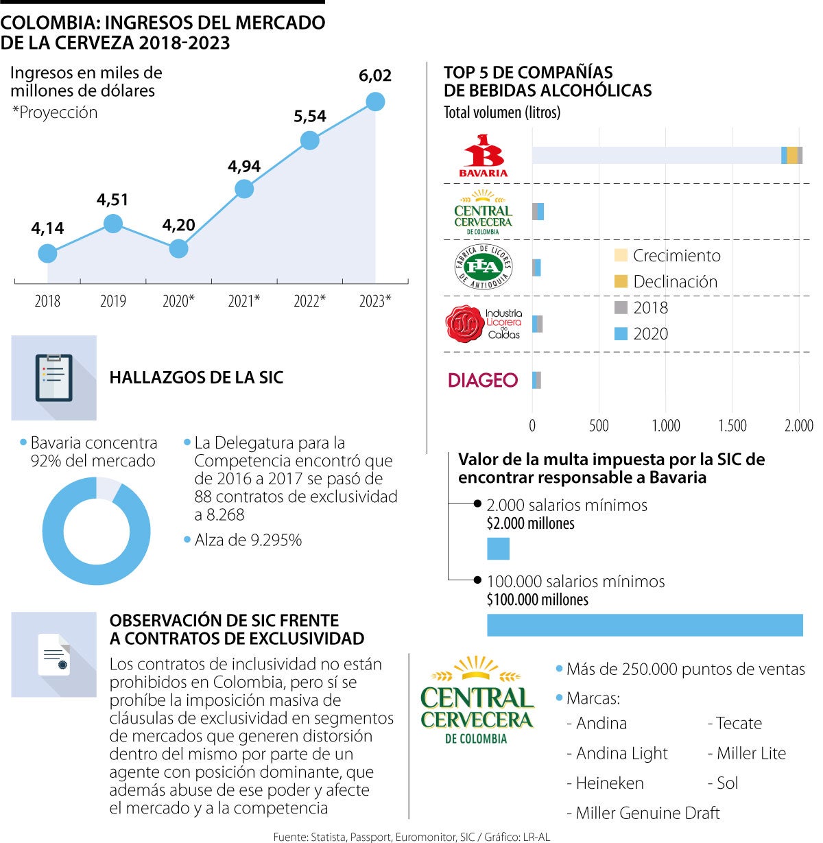 Bavaria, según la máxima autoridad en temas de competencia, tiene hoy 92% del mercado de cervezas en el país. La empresa del Grupo Santo Domingo maneja 36 marcas, entre las que destacan Águila, Club Colombia y Corona, entre otras.
