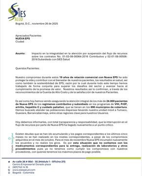 “Hoy debemos informarles (...) que la suspensión total de la atención a los pacientes por parte de la Nueva EPS ha llegado al punto más crítico, afectando la integralidad en la prestación del servicio y poniendo en riesgo la vida de los pacientes”, sostuvo la IPS.