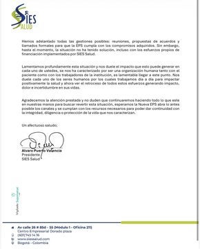 La entidad finalizó la carta lamentando la situación y el impacto negativo que puede causar en las miles de personas a las que les prestan el servicio.