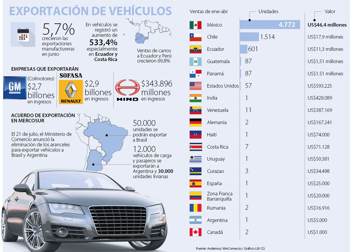 La medida que fue anunciada por el Ministerio de Comercio, el pasado 21 de julio, permitirá que Colombia exporte alrededor de 30.000 unidades de vehículos livianos a Argentina y cerca de 50.000 unidades a Brasil. Según la ministra saliente María Claudia Lacouture, esto significaría “un crecimiento de las exportaciones colombianas, con oportunidades reales y competitivas”.