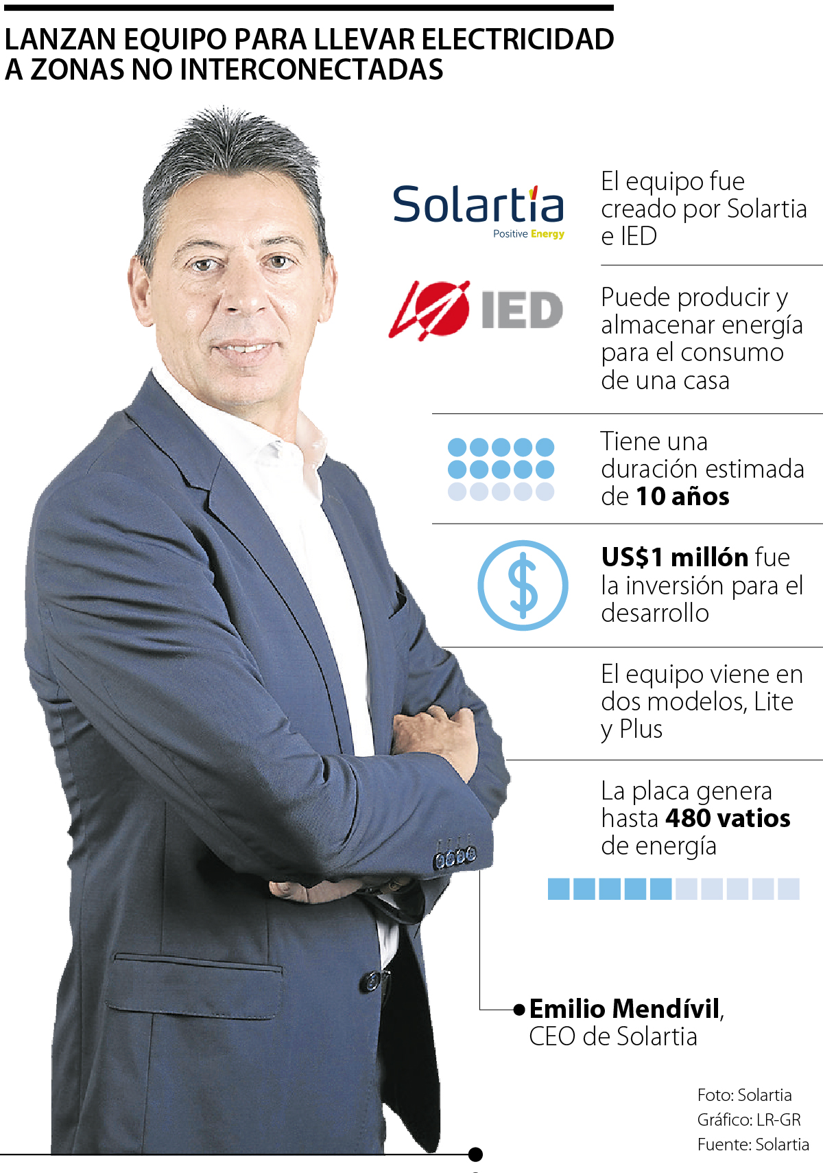 Con el objetivo de llevar energía a zonas no interconectadas, Solartia e IED desarrollaron un equipo capaz de generar y almacenar energía solar. Para esto, la compañía invirtió más de dos años y US$1 millón. Según Emilio Mendívil, CEO de Solartia, solo en Colombia hay 325.000 familias que podrían hacer uso de esta tecnología, ya que no están conectados al Sistema Interconectado Nacional.
