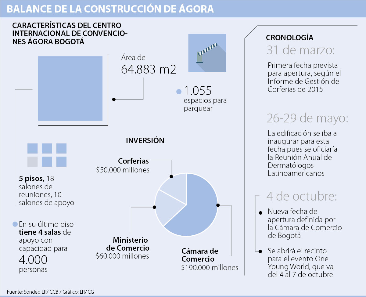 La fecha de apertura de Ágora seguirá siendo la misma, según declaró la Cámara de Comercio de Bogotá, principal inversionista de la edificación. La entidad señaló que el One Young World, que se realizará entre el 4 y 7 de octubre, sigue siendo el evento con el que se inaugurará el centro.