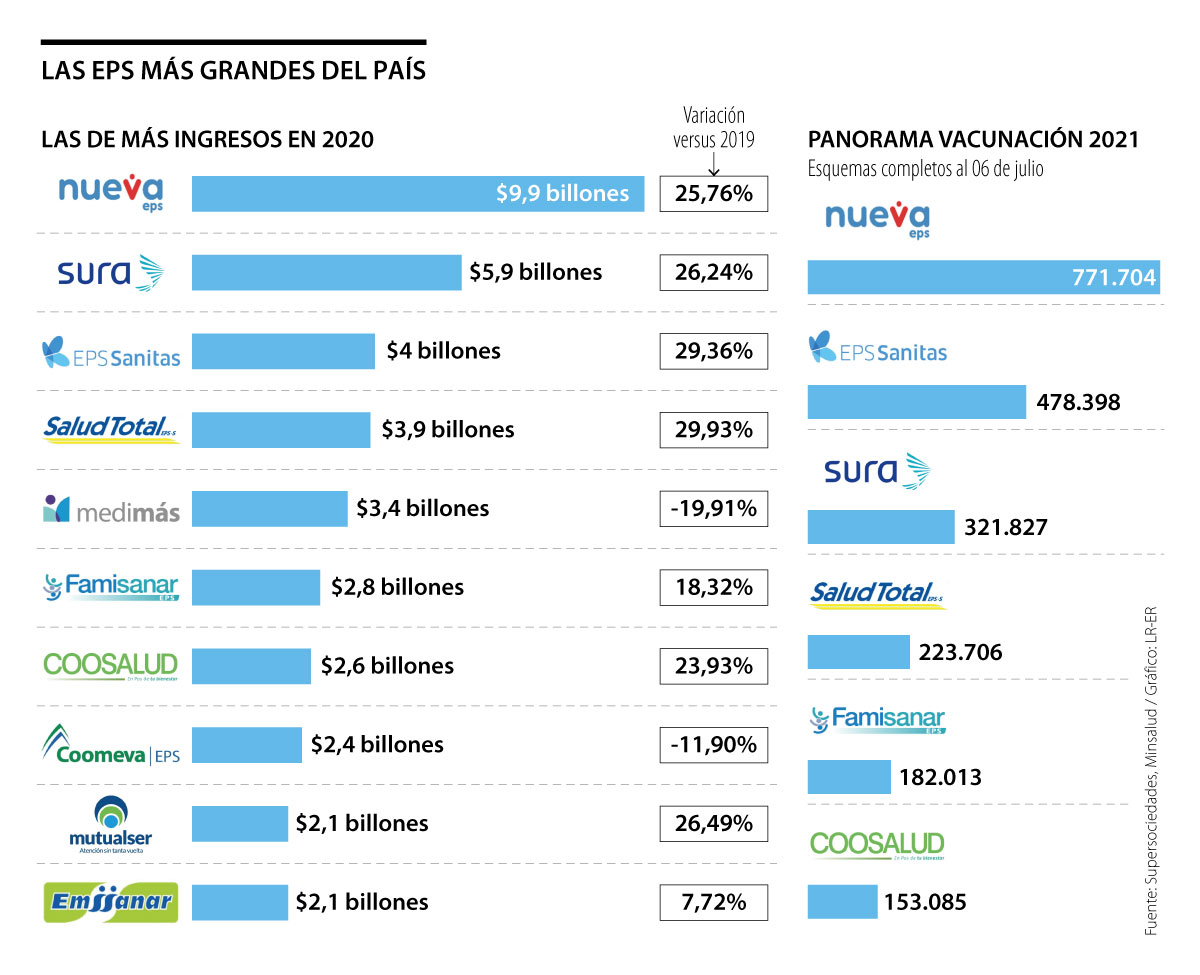 En ese conteo también destacan las entidades con mayores ingresos en 2020. Por ejemplo, al 6 de julio, Nueva EPS lideraba en número de esquemas completos, con 771.704 pacientes; seguida de Sanitas EPS, con 478.398 y EPS Sanitas cerraba el top tres, con 321.827 de sus afiliados.