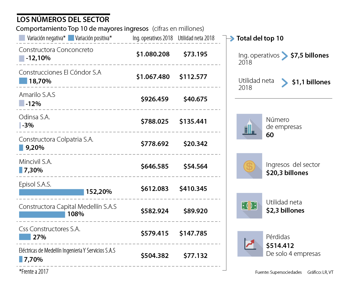 La desaceleración que mostró el sector constructor durante 2018 no fue impedimento para que las compañías que integran la industria, junto con las de ingeniería, lograran generar ingresos por $20,33 billones, cifra que representó un crecimiento de 17,6% frente a 2017.