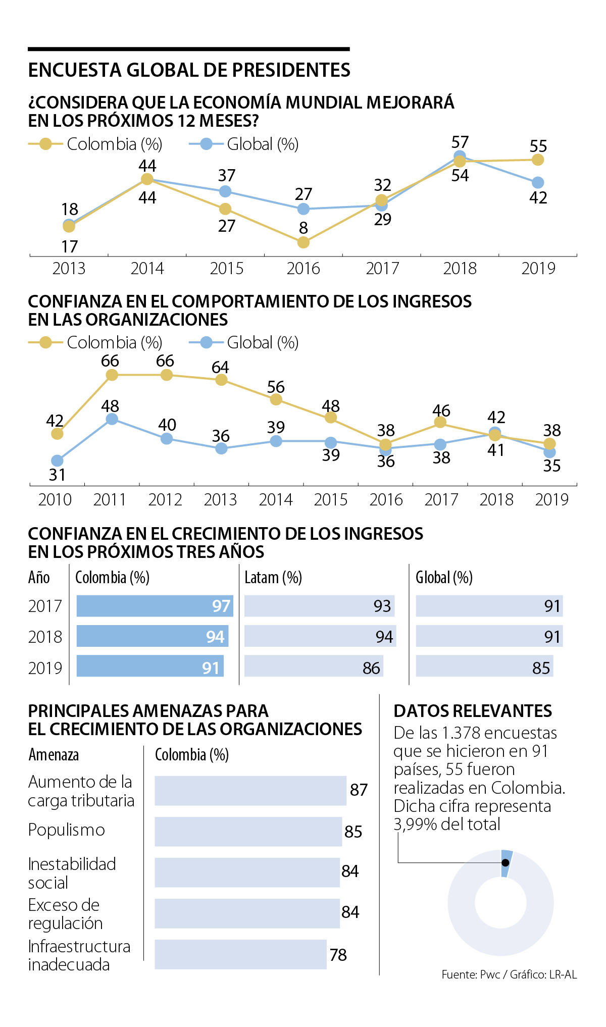 Desde hace 22 años, la consultora británica PricewaterhouseCoopers (PwC) presenta una encuesta global de CEO que analiza la confianza y los retos que perciben los altos ejecutivos en el comportamiento de la economía. En 2019, el sondeo llegó a su novena edición en el caso colombiano.