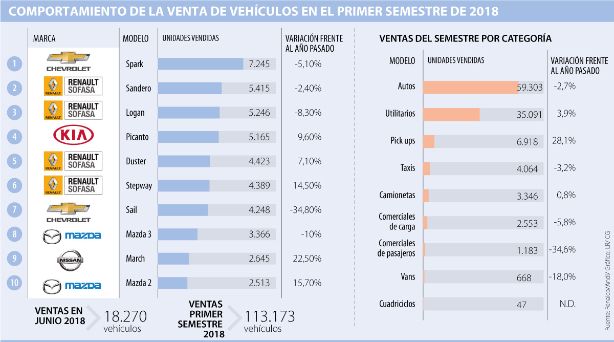 Al momento de revisar los modelos que más fueron demandados durante los primeros seis meses del año, el acumulado muestra que el Chevrolet Spark lidera las preferencias pues logró una participación de 6,4%, con un total de 7.254 unidades entregadas. Aunque está en el primer lugar, las cifras significaron una caída de 5,1% frente a 2017.