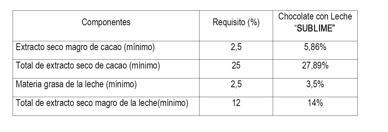 “Si Sublime tiene 17% de maní, el resto es chocolate con leche (83% aproximadamente) al hacer el cálculo de contenido de extracto seco de cacao en esta porción se obtiene que Sublime tiene 27.8% de éste (manteca de cacao + masa de cacao)”, detalló.