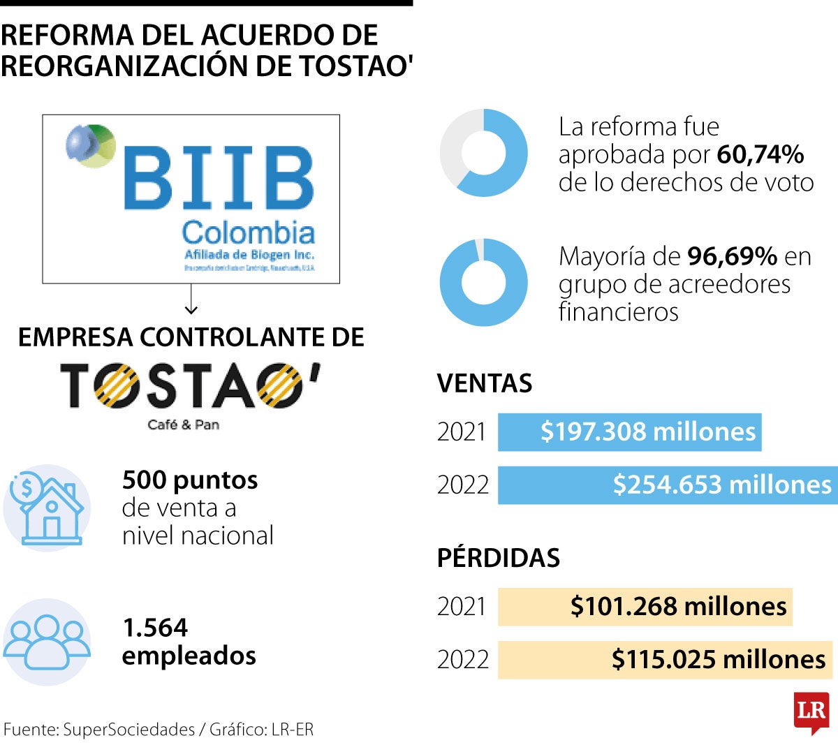 La Superintendencia de Sociedades confirmó la aprobación del proceso de reorganización, con sus acreedores, en BBI Colombia S.A.S., sociedad que opera la cadena de cafeterías Tostao'. El proceso de pago de obligaciones se llevará a cabo según los artículos 31, 35 y 36 de la Ley 1116 de 2006.