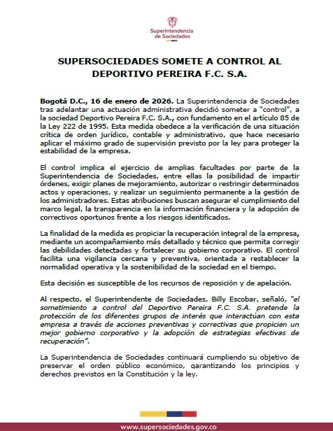 La Superintendencia de Sociedades, luego de adelantar una actuación administrativa, resolvió someter a la sociedad Deportivo Pereira F.C. S.A. a la medida de control. Esta decisión se fundamenta en la constatación de una situación crítica en los ámbitos jurídico, contable y administrativo, lo que hace necesario aplicar el nivel más alto de supervisión previsto en la ley para salvaguardar la estabilidad de la empresa.