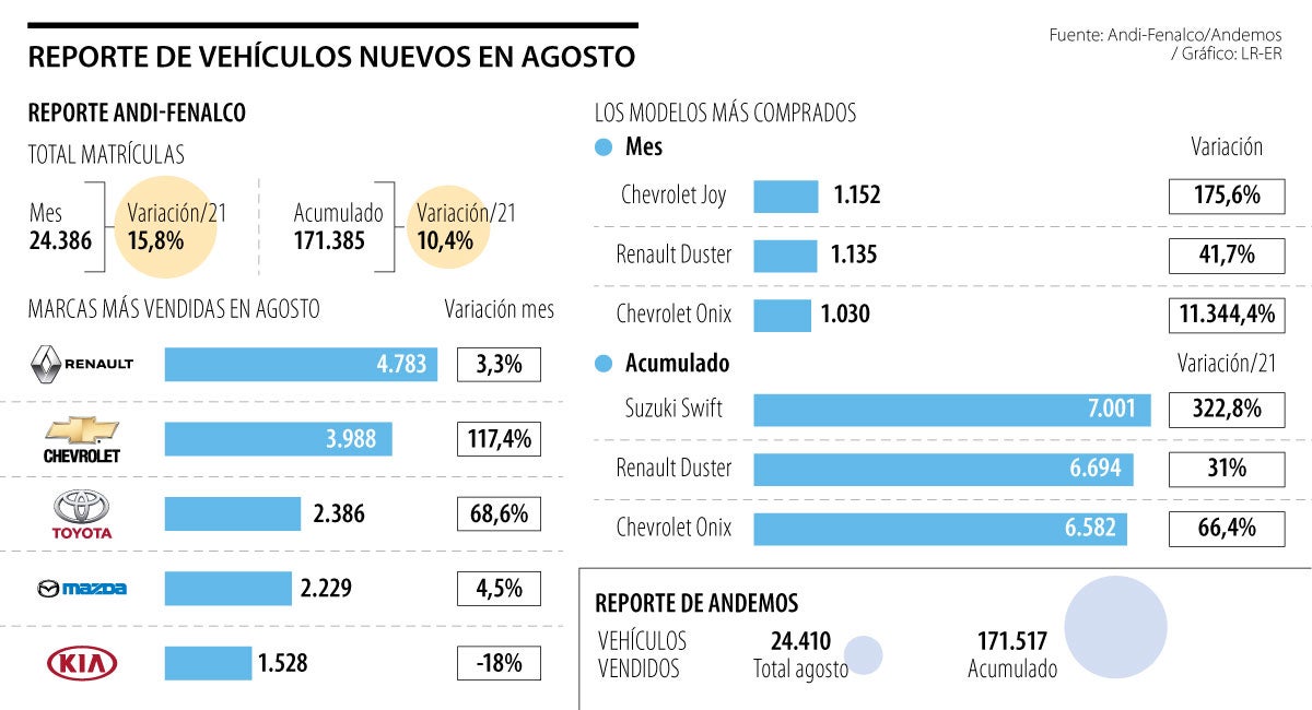 En Colombia, el lugar de las marcas líderes en ventas se lo vienen disputando desde hace años Renault, Chevrolet y Toyota, las cuales lideraron en ese mismo orden las unidades vendidas en agosto. Renault comercializó 4.783 en agosto y totalizó en el año 32.299 carros; Chevrolet vendió 3.988 en el mes y 27.587 en lo que va del año; y Toyota puso a rodar 2.386 unidades en agosto para sumar 16.441 en total.