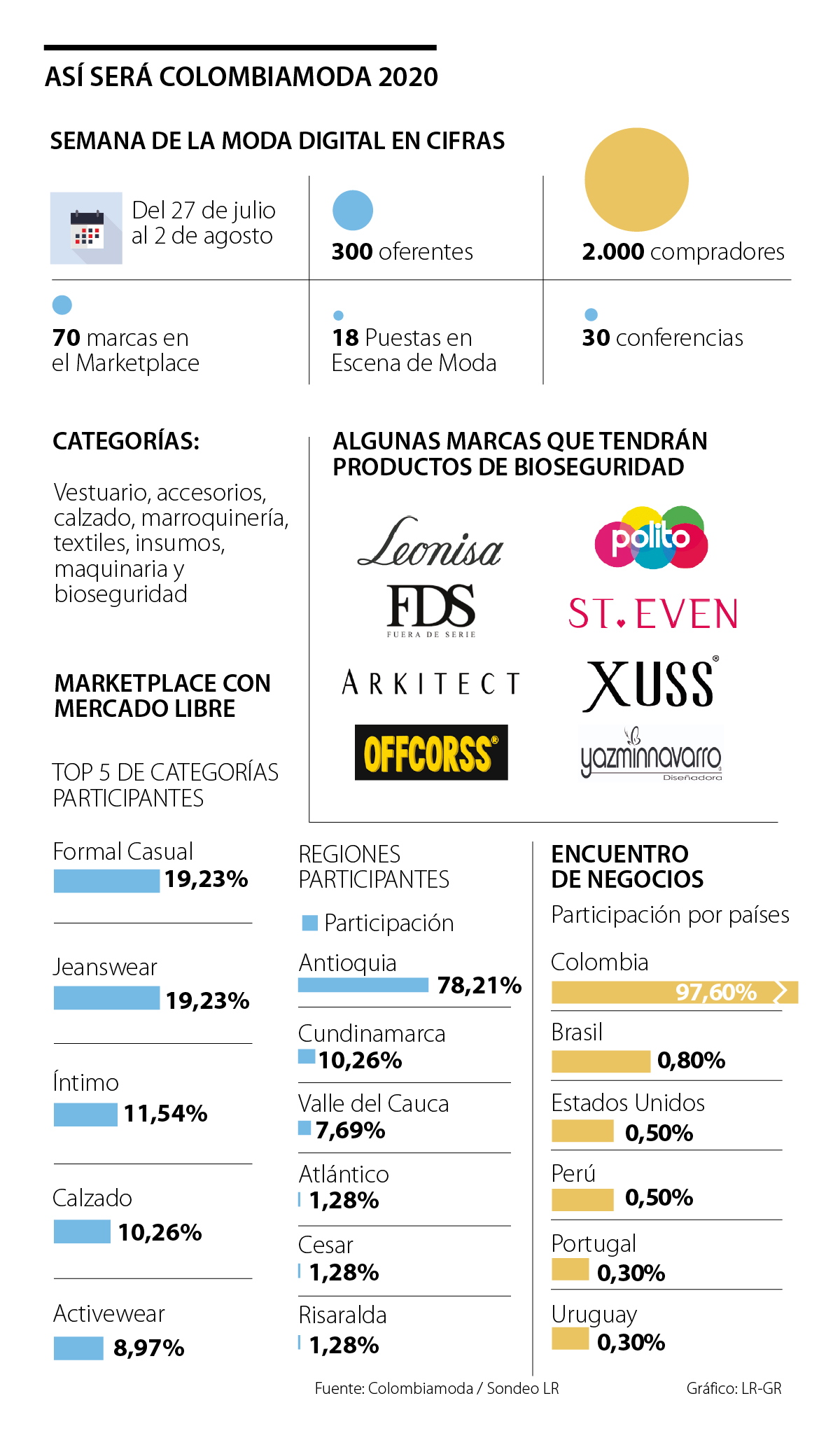Para esta edición de Colombiamoda, Inexmoda lanzó una alianza con Mercado Libre para que 70 marcas presenten sus productos en una tienda online para los consumidores. Además, se tendrá un encuentro de negocios en el que se esperan por lo menos 600 citas y en el que participarán 300 oferentes y habrá 2.000 compradores. Para el público, habrá otros espacios de interés como 18 puestas en escena de moda para conocer las colecciones y una nueva sección con master class, talleres y asesorías con expertos.