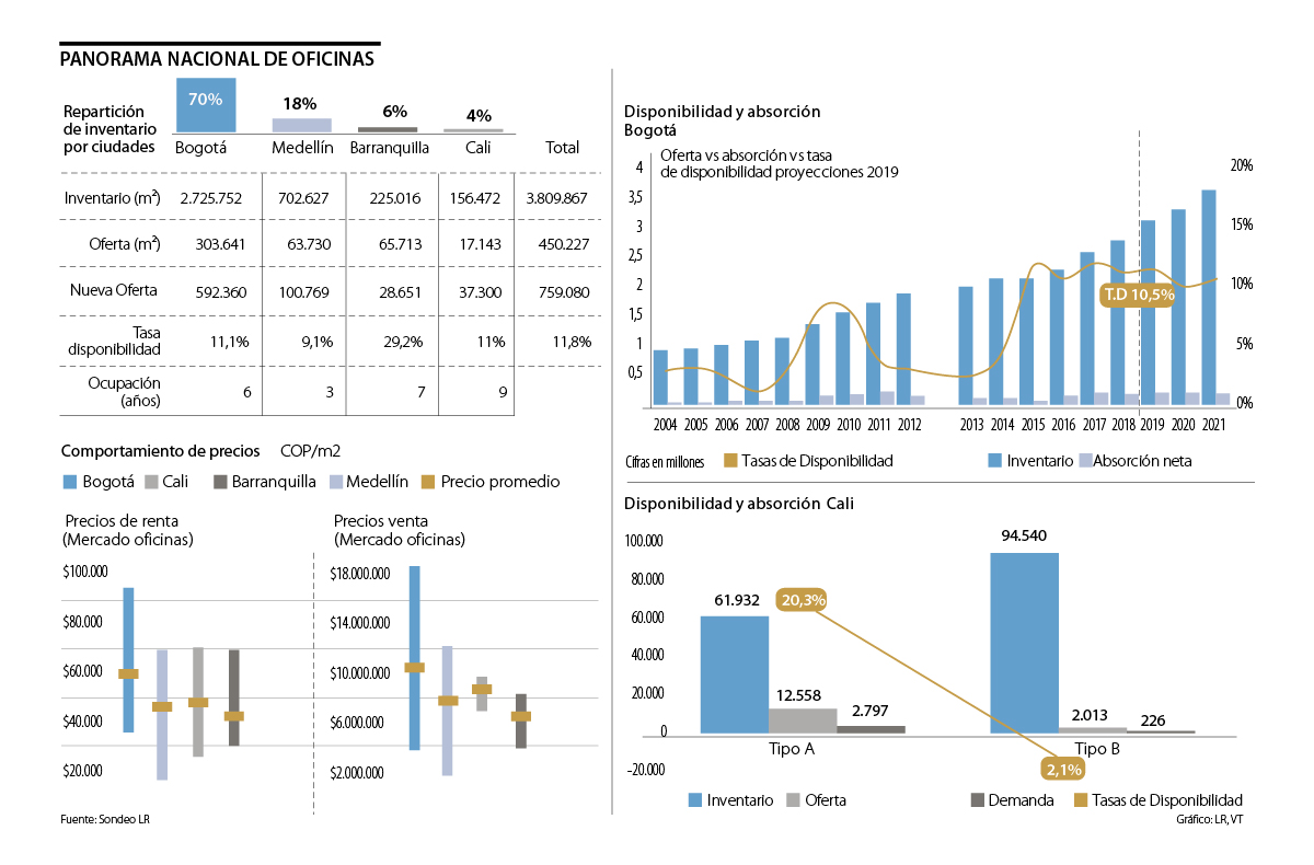 La inmobiliaria también afirmó que este año el mercado de oficinas tuvo una disminución de la oferta, “en donde se registra una tasa de disponibilidad de 9,8% bajando un dígito en comparación con 2018. Es la tasa más baja en los últimos dos años”, agregan en su reporte y resaltan que hasta marzo en Cali los edificios de categoría A aumentaron 12% en comparación a 2018.