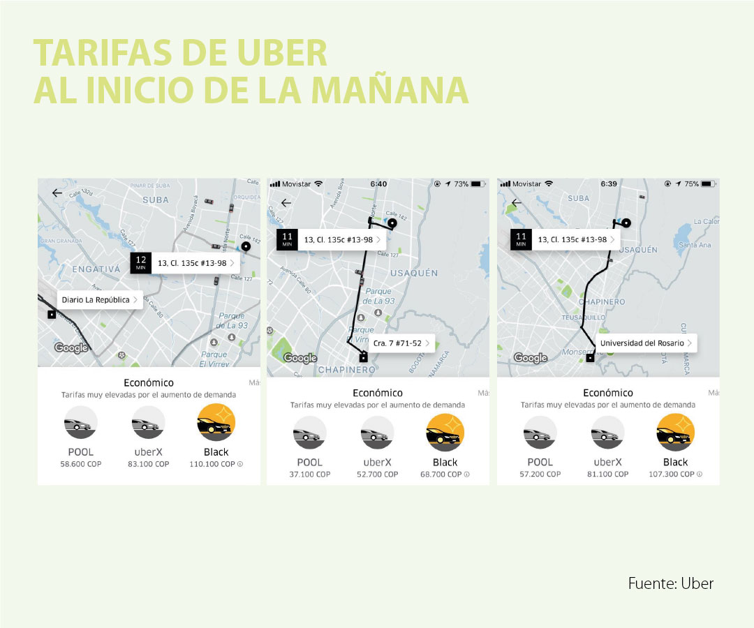 Sin embargo, ya en la mitad de la mañana, para esta ruta las tarifas bajaron hasta 22%, según podemos evidenciar en los cálculos de Uber.