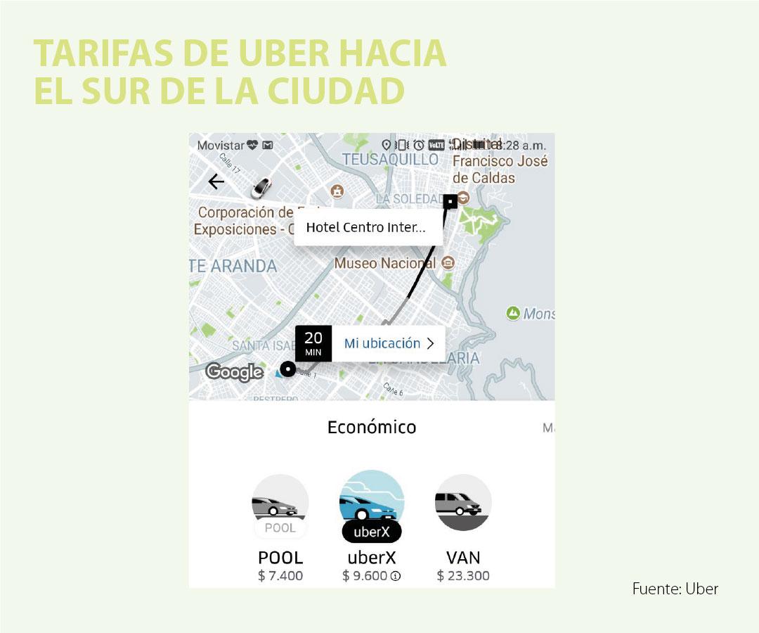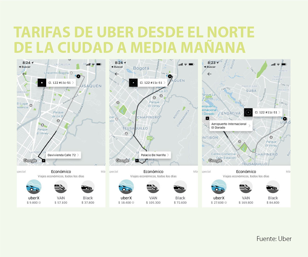 Así mismo, desde el barrio country en el norte de la Capital, hasta la Universidad del Rosario, en el centro de la ciudad, el trayecto suele costar un promedio de $30.000. En la mañana tuvo un valor de $107.300 en Uber Black.