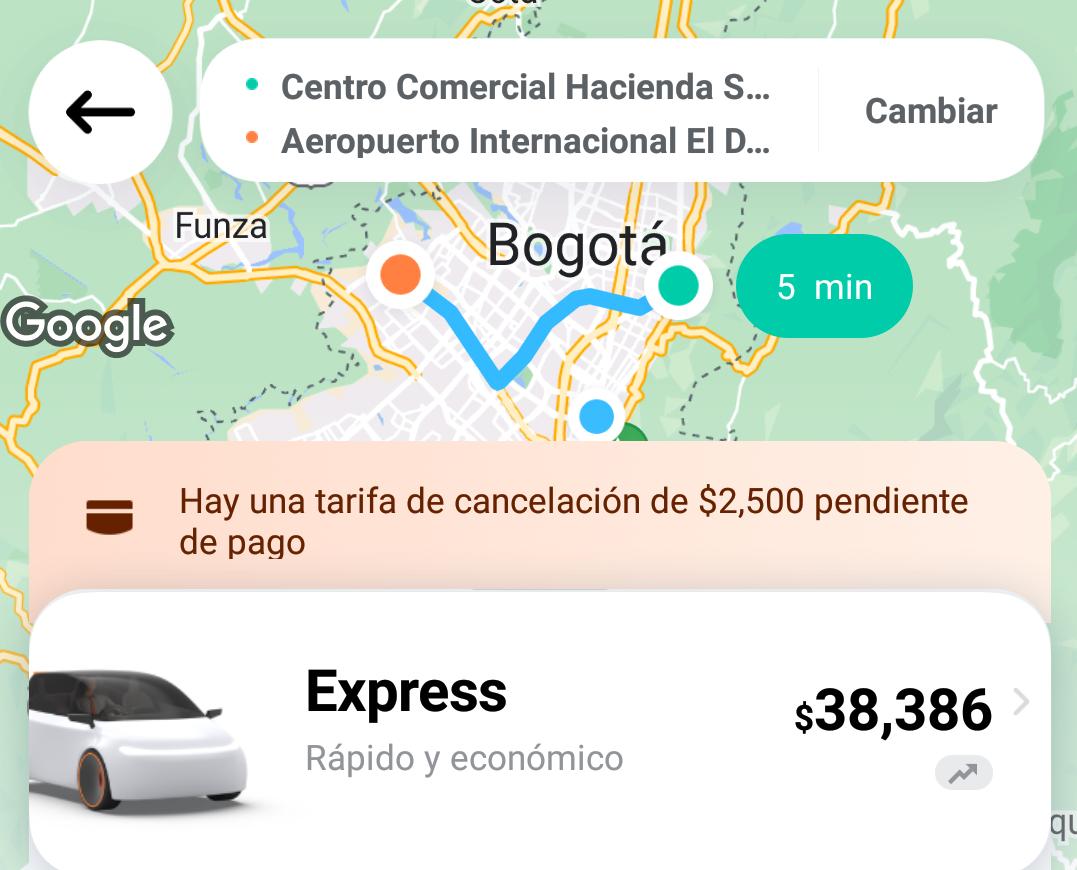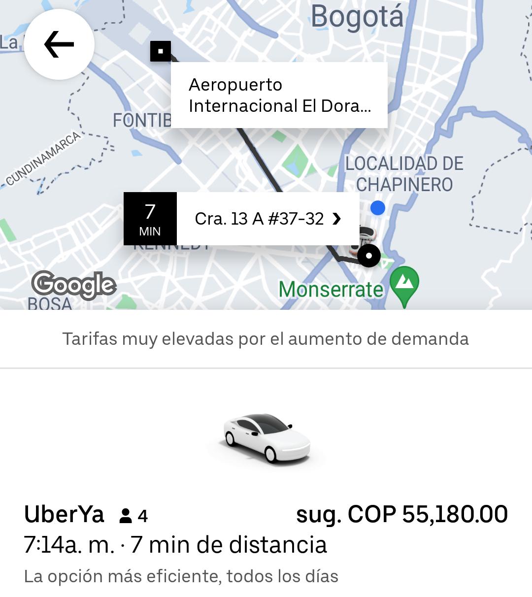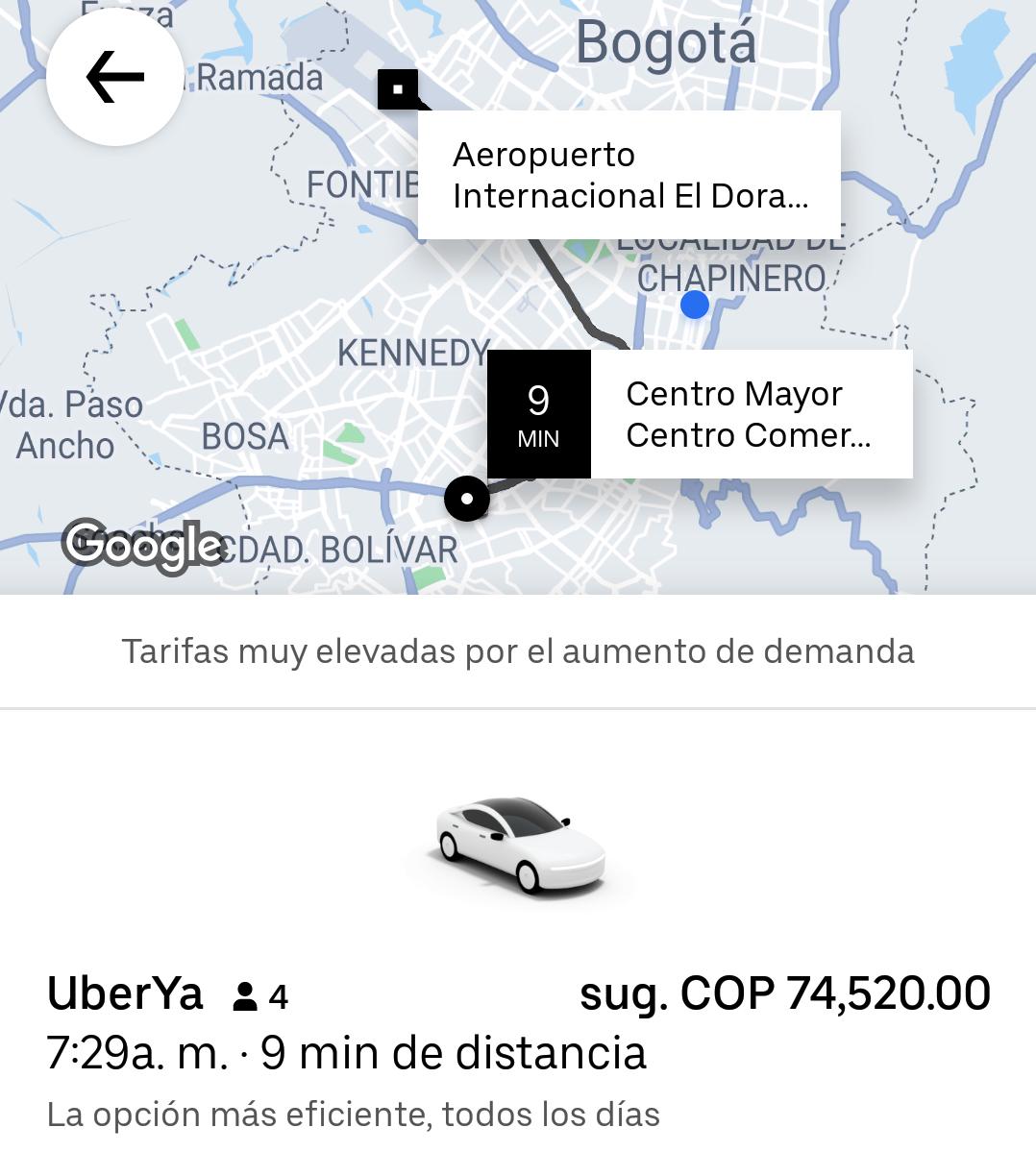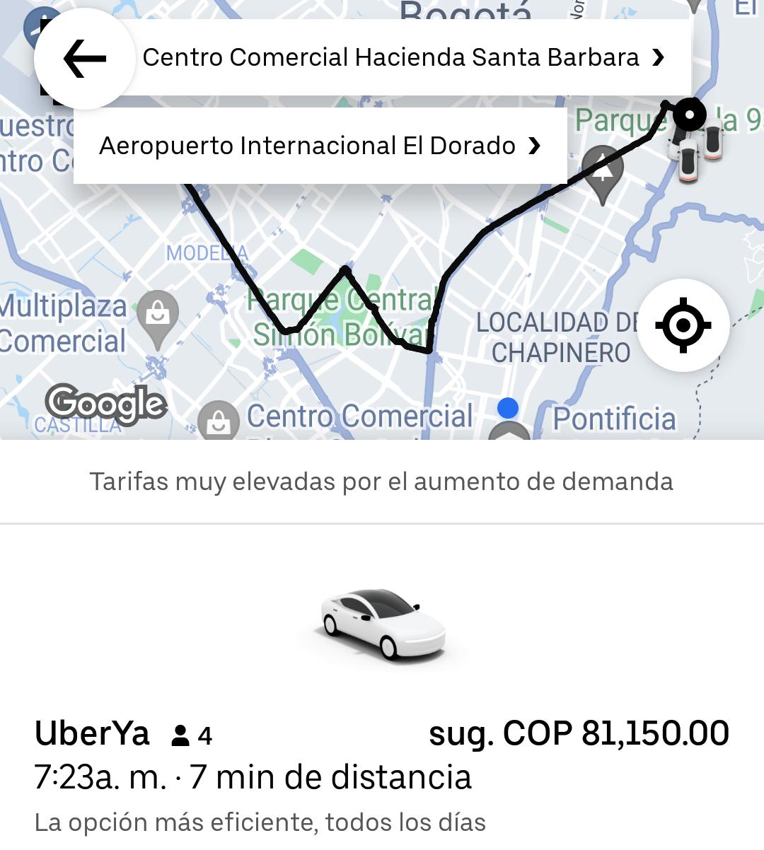 Un trayecto entre el Diario La República y el Aeropuerto El Dorado hoy costó $55.180 en Uber, mientras que ayer valía $21.500