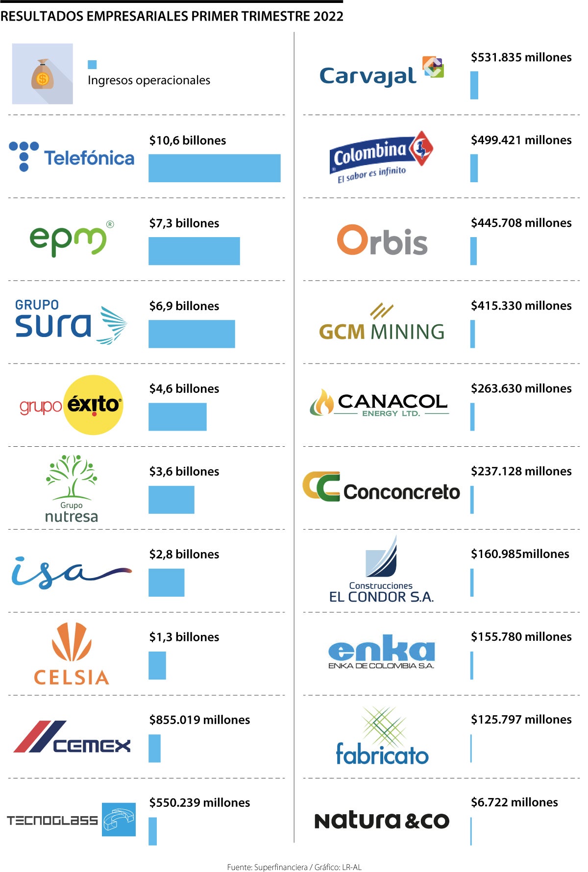 ISA, compañía de energía, fue otra que evidenció resultados positivos, con ingresos operacionales que sumaron $2,8 billones, un crecimiento de 17%. A la lista, y en séptima posición, se suma Celsia, empresa perteneciente al Grupo Argos, que en el primer trimestre alcanzó ingresos consolidados que sumaron $1,3 billones, con un aumento de 33,6% respecto a 2021.